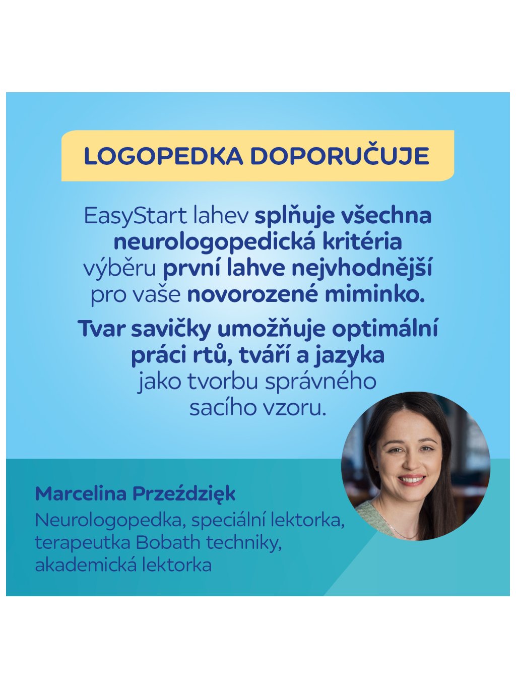 „Lahev EasyStart splňuje všechna neurologedická kritéria pro výběr nejlepší první kojenecké lahve pro vaše dítě. Tvar savičky zajišťuje optimální fungování rtů, tváří a jazyka a také správnou tvorbu vzoru sání."