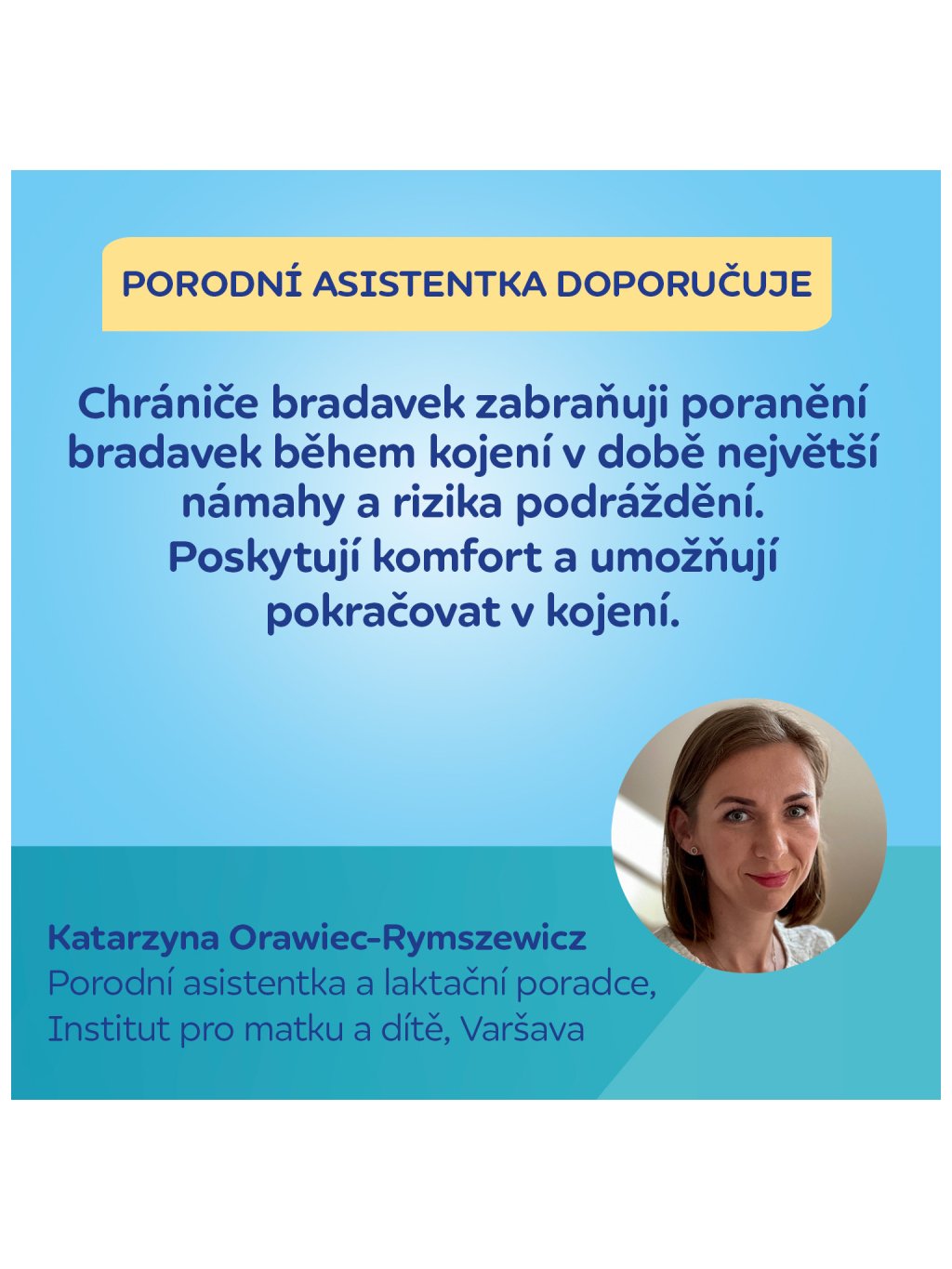 Udržujte chrániče prsních bradavek čisté. Před prvním a každým dalším použitím je umyjte v teplé vodě s jemným mycím prostředkem a důkladně opláchněte. Chrániče bradavek dezinfikujte ve vroucí vodě asi 3 minuty. Chrániče bradavek nemyjte v myčce na nádobí. K čištění nepoužívejte antibakteriální prostředky. Během používání a čištění se vyvarujte hrubých nástrojů, které by mohly poškrábat povrch. Chrániče bradavek lze dezinfikovat v přiloženém pouzdře dle návodu. Nenechávejte chrániče bradavek na přímém slunci nebo v blízkosti zdroje tepla. Chránič aplikujte pouze na suché a čisté prso. Nepoužívejte žádné krémy ani vazelínu. Před každým použitím výrobek zkontrolujte. Při prvních známkách poškození nebo opotřebení vyhoďte. Nezvětšujte otvory a nevytvářejte další otvory v chráničích bradavek, protože by mohlo dojít k poškození. Před použitím přípravku se doporučuje poradit se s porodní asistentkou nebo pediatrem. UPOZORNĚNÍ! Tento výrobek není hračka. Uchovávejte mimo dosah dětí. Čisté a suché chrániče bradavek uložte do pouzdra. Uschovejte si návod k použití, protože obsahuje důležité informace. Kód šarže je na obalu.