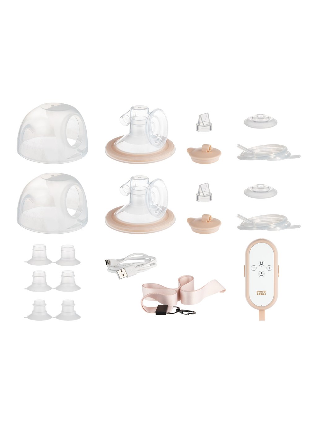 Sada obsahuje: napájecí kabel typu C, ovládací zařízení odsávačky mléka (tělo odsávačky), silikonová membrána 2 ks, zpětný ventil 2 ks, trychtýř o velikosti 27 mm 2 ks, zásobník na sběr mléka 2 ks, uzávěr membrány 2 ks, silikonová hadička 2 ks, silikonové trychtýřové vložky 6 ks (3 různé velikosti: 2x 19mm, 2 x 21mm, 2x 24mm), šňůrka k zavěšení odsávačky, nástavec na ramínko podprsenky 2 ks.