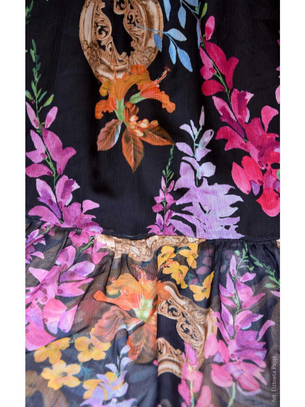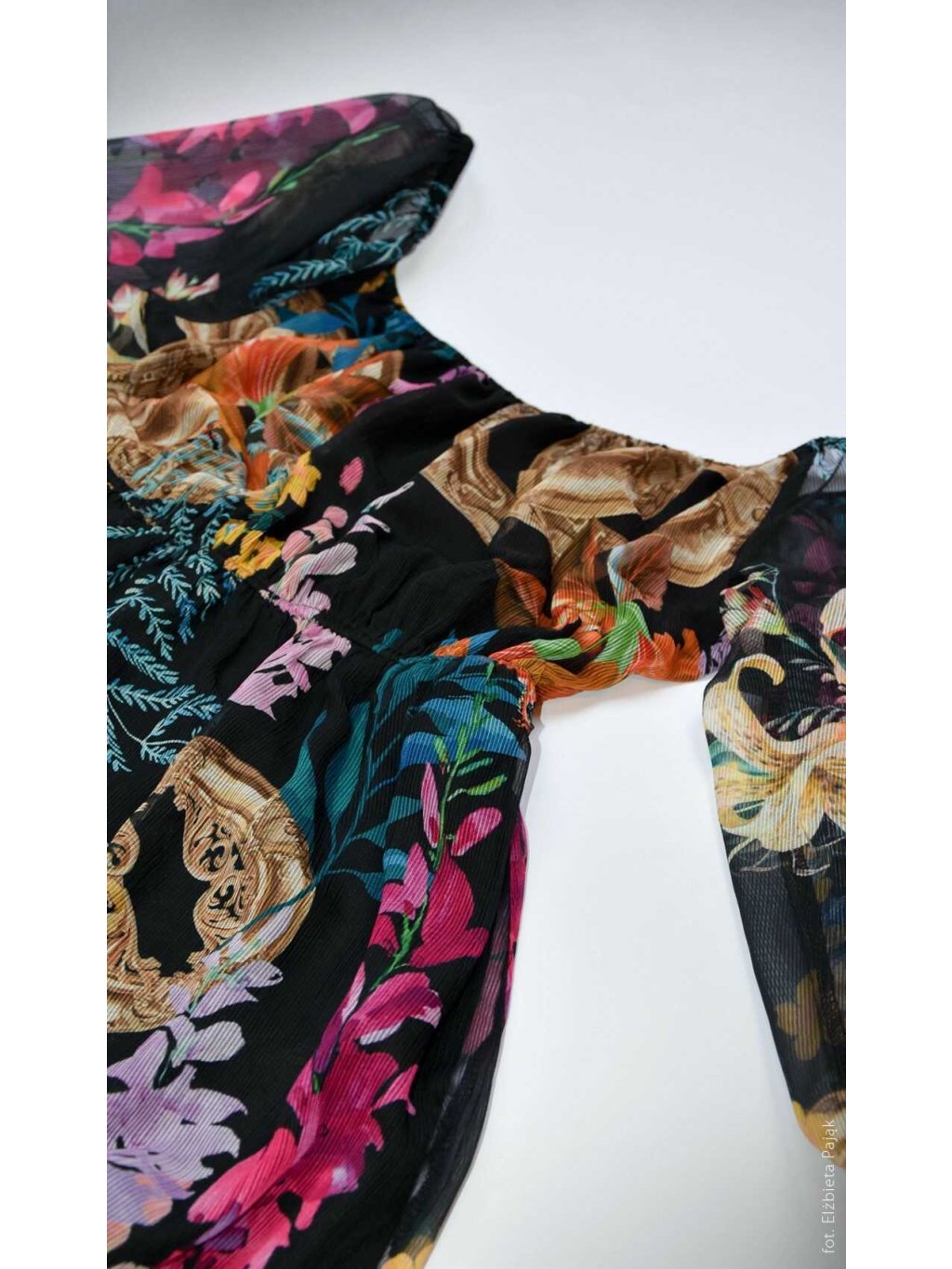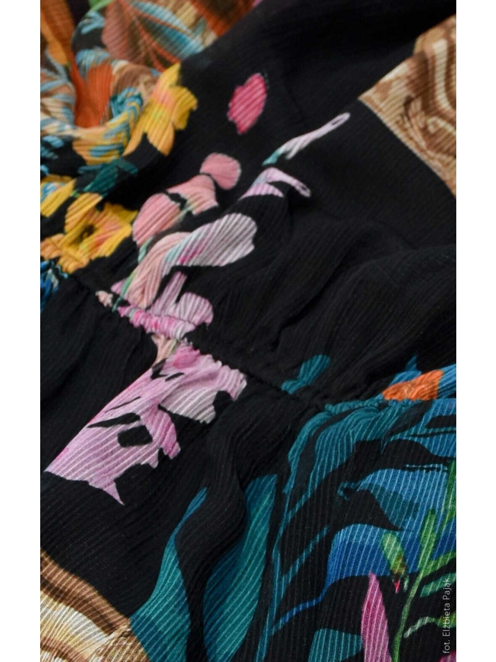 - Lehký šifon s barevným potiskem – elegantní a výrazný