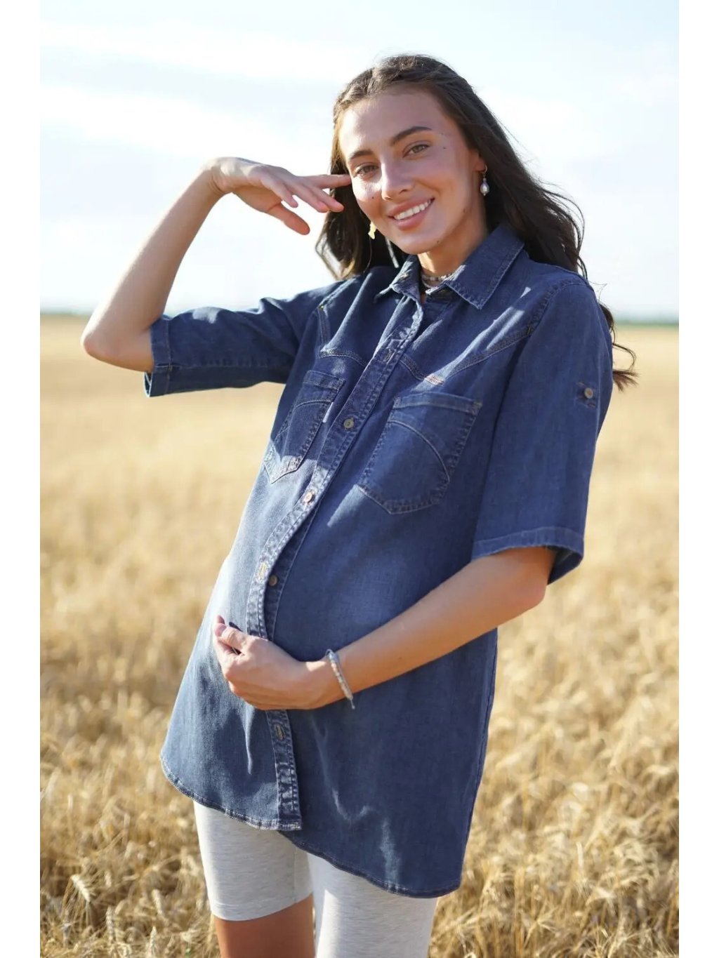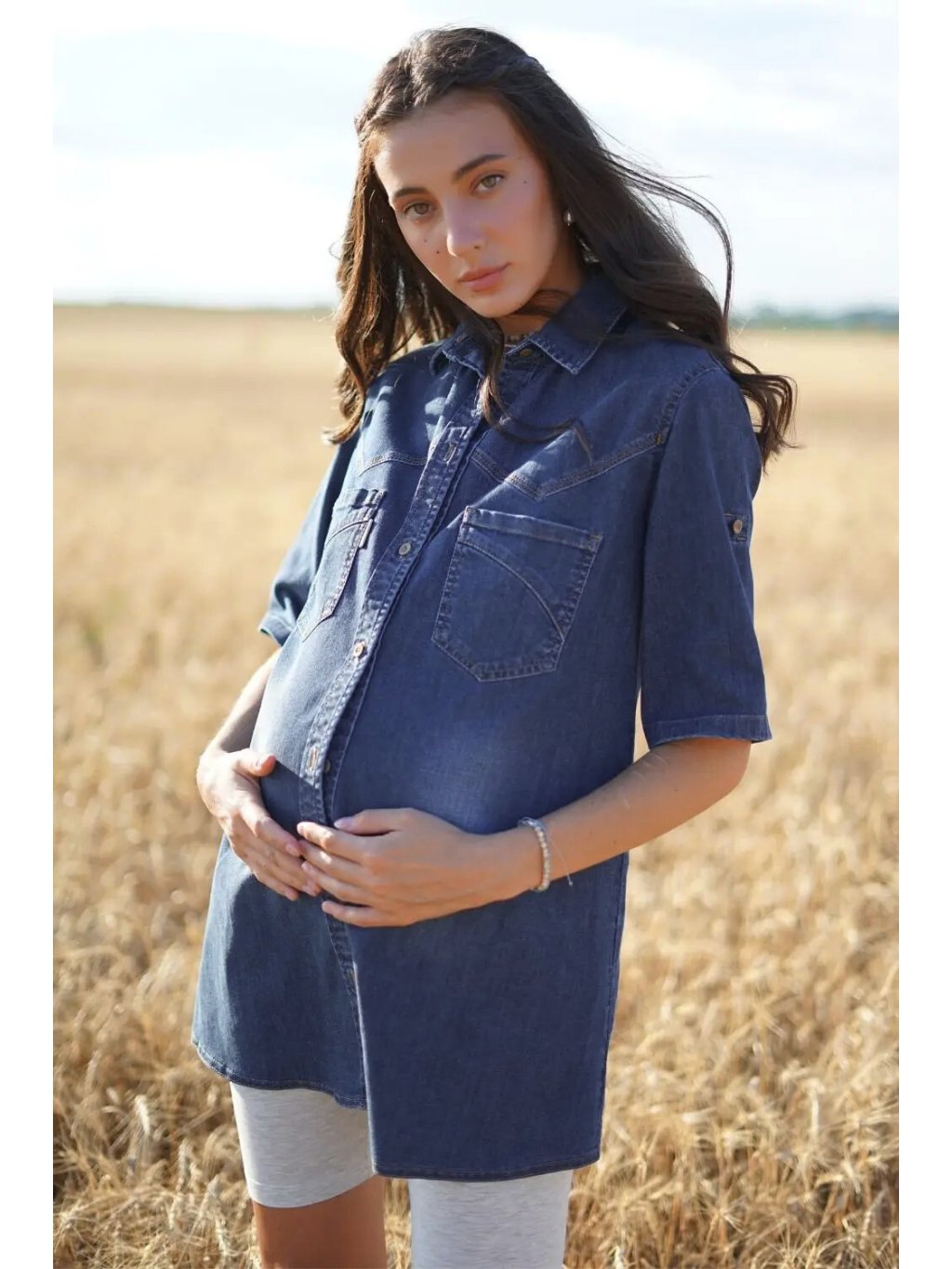 Tato stylová košile pro těhotné je ušitá z měkkého bavlněného denimu a navržená tak, aby poskytovala pohodlí i eleganci během těhotenství i po něm. Prodloužený střih se krásně přizpůsobí rostoucímu bříšku, zatímco středně dlouhé rukávy dodávají nadčasový vzhled. Díky přednímu zapínání na knoflíky je košile praktická také pro kojení, což z ní dělá skvělý kousek do poporodního šatníku.