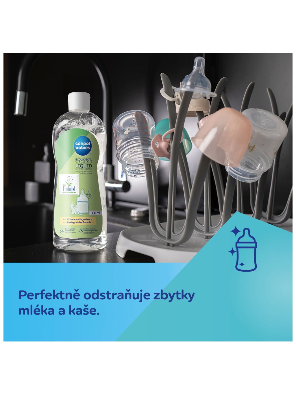 Ekologický mycí prostředek na kojenecké lahve a savičky byl vyroben s ohledem na zdraví a bezpečnost dítěte. Je hypoalergenní, bezbarvý a obsahuje 97% přírodních složek. Účinně odstraňuje veškeré zbytky mléka, džusů, kaší a potravin. Perfektně se oplachuje. Mycí prostředek je jemný k rukám, má neutrální pH pro pokožku a byl dermatologicky testován. K účinnému vyčištění kojeneckého příslušenství, jako jsou lahve, dudlíky, dudlíky, dětské nádobí, hračky a části odsávačky mléka, stačí malé množství mycího prostředku. Canpol babies Ekologický mycí prostředek na kojenecké lahve a savičky je certifikován ekoznačkou EU – oficiální evropskou značkou udělovanou produktům, které jsou šetrné k životnímu prostředí a které splňují vysoké kvalitativní a zdravotní standardy: PL/019/009.