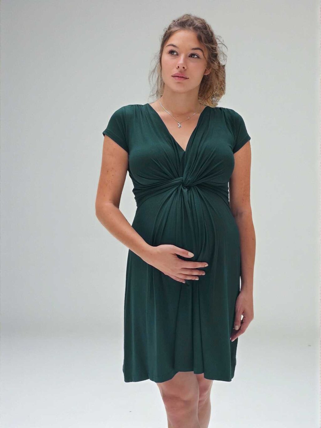 Elegantní bambusové těhotenské šaty Vivianne 2v1 – tmavě zelené smaragdové, uzlový střih, krátký rukáv
