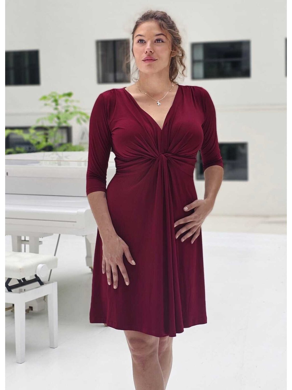 Odstín red wine s předním uzlem podtrhuje ženskost a dodává šatům luxusní tón, který se snadno kombinuje s doplňky v neutrálních i výrazných barvách.