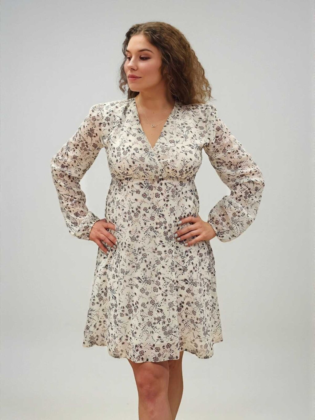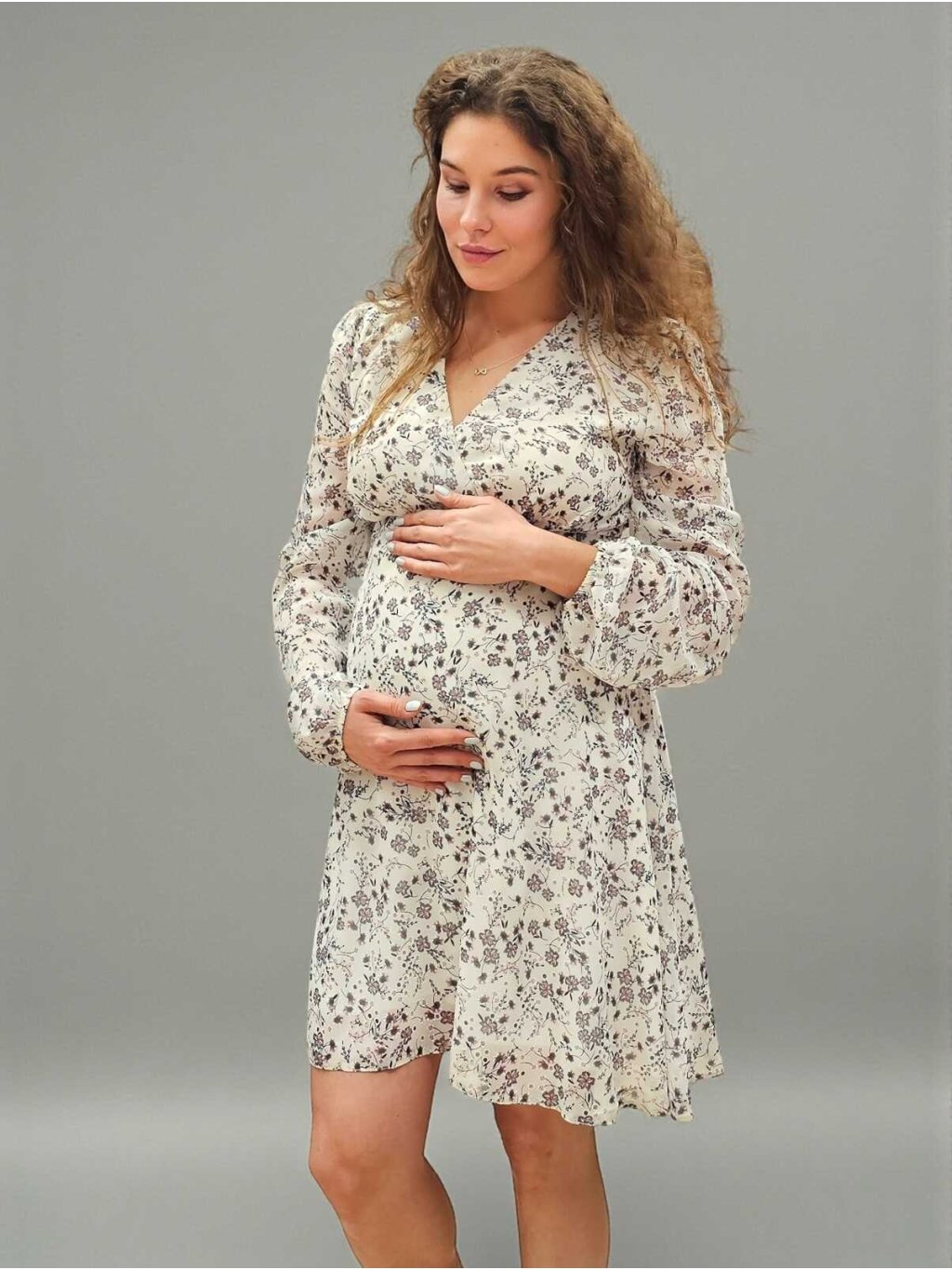 Elegantní šifonové těhotenské a kojicí šaty Solenne 3v1 – bílé s šedorůžovými kvítky, dlouhý rukáv