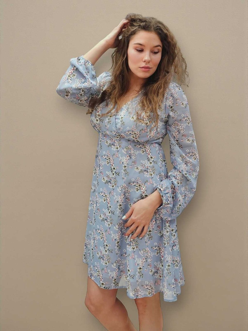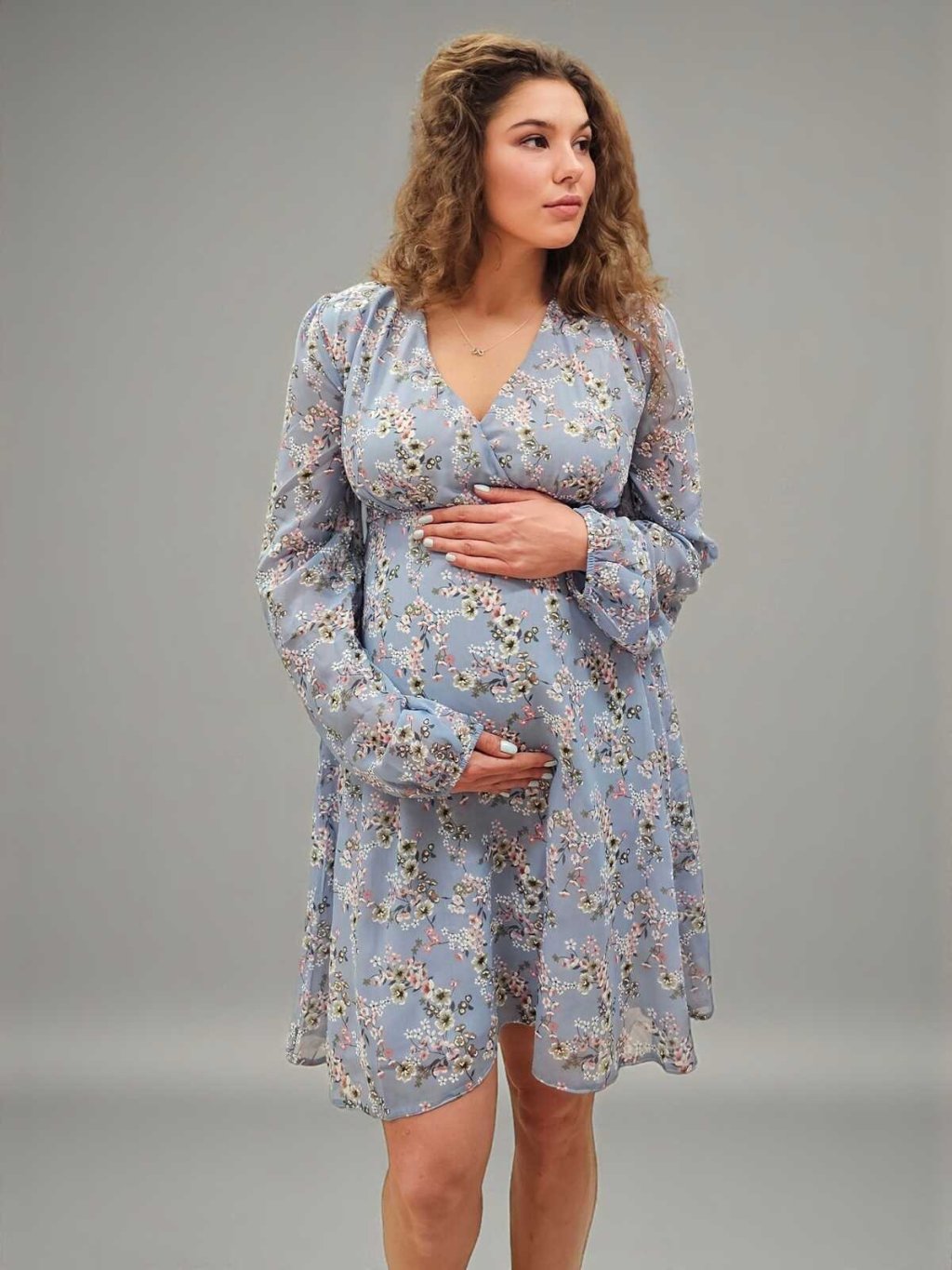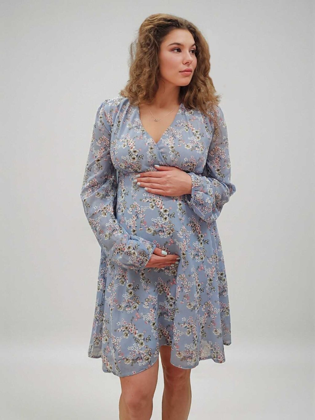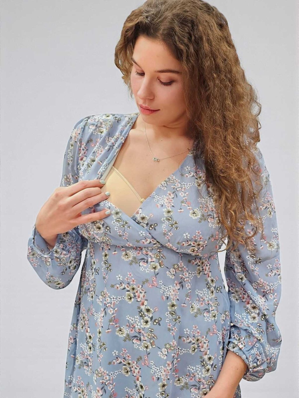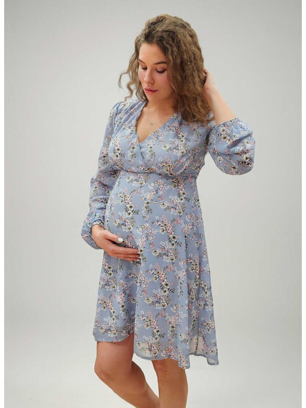 Elegantní šifonové těhotenské a kojicí šaty Solenne 3v1 – nebesky modré s růžovo-bílými kvítky, dlouhý rukáv