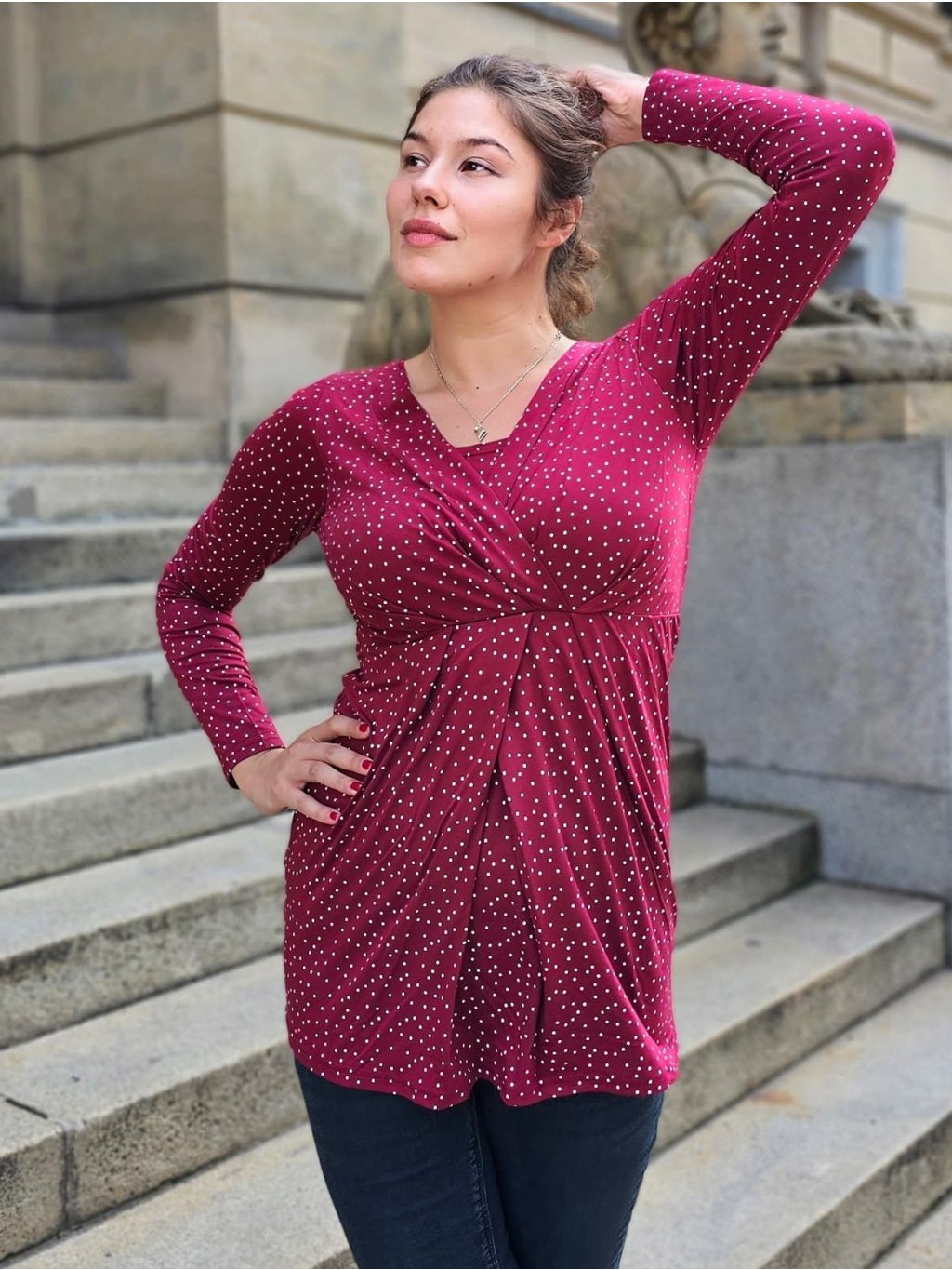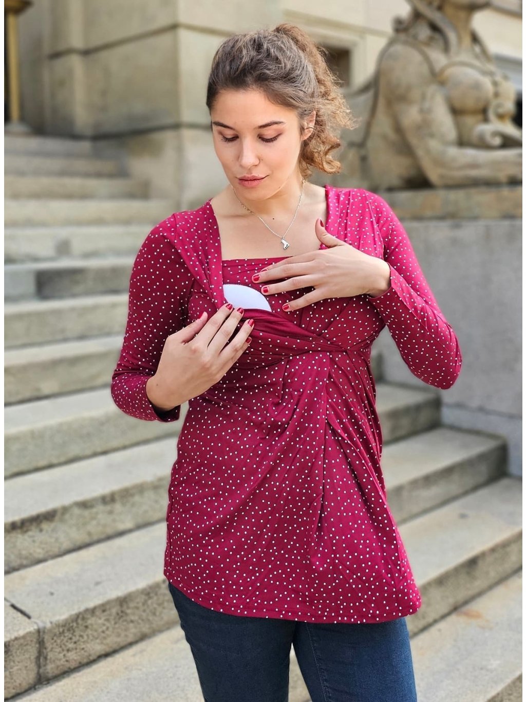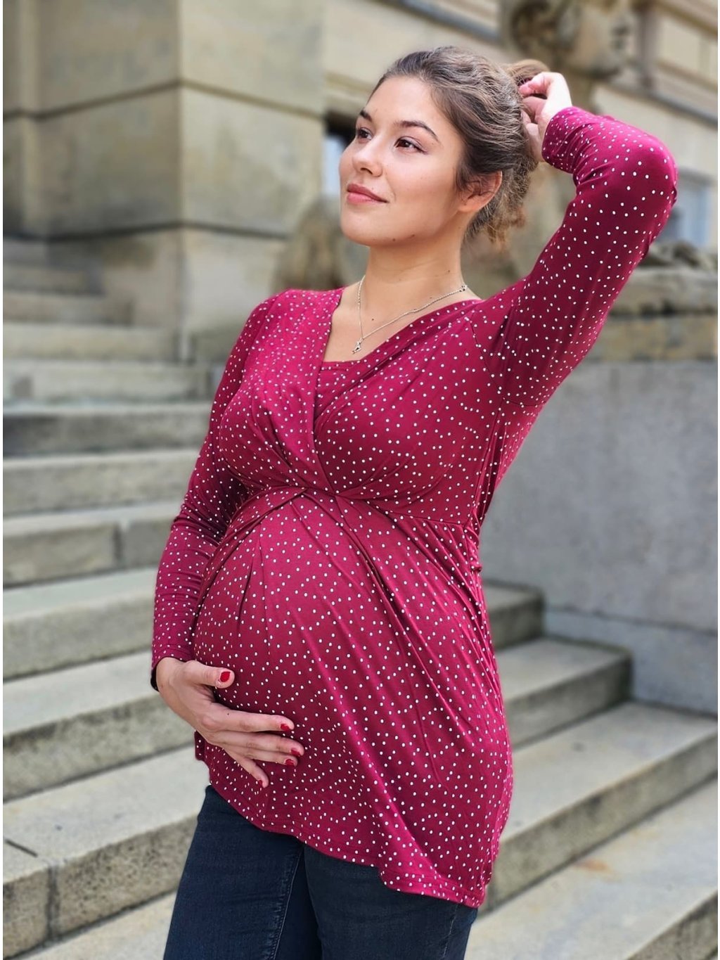Těhotenská a kojicí halenka Gissa 3v1 v elegantní bordó barvě s jemnými puntíky je navržená tak, aby vás provázela v každé fázi mateřství. V těhotenství se pohodlně přizpůsobí rostoucímu bříšku, po porodu umožní diskrétní kojení a poté ji můžete nosit jako běžnou halenku.