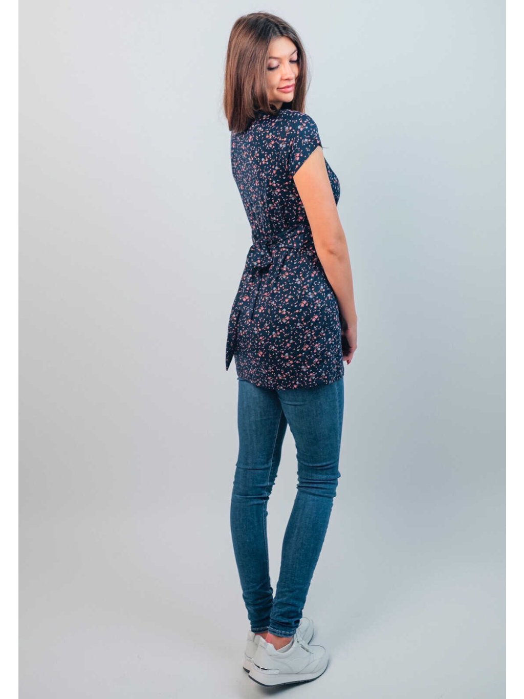 Těhotenská a kojicí halenka Gissa 3v1 – tmavě modrá s kvítky, krátký rukáv