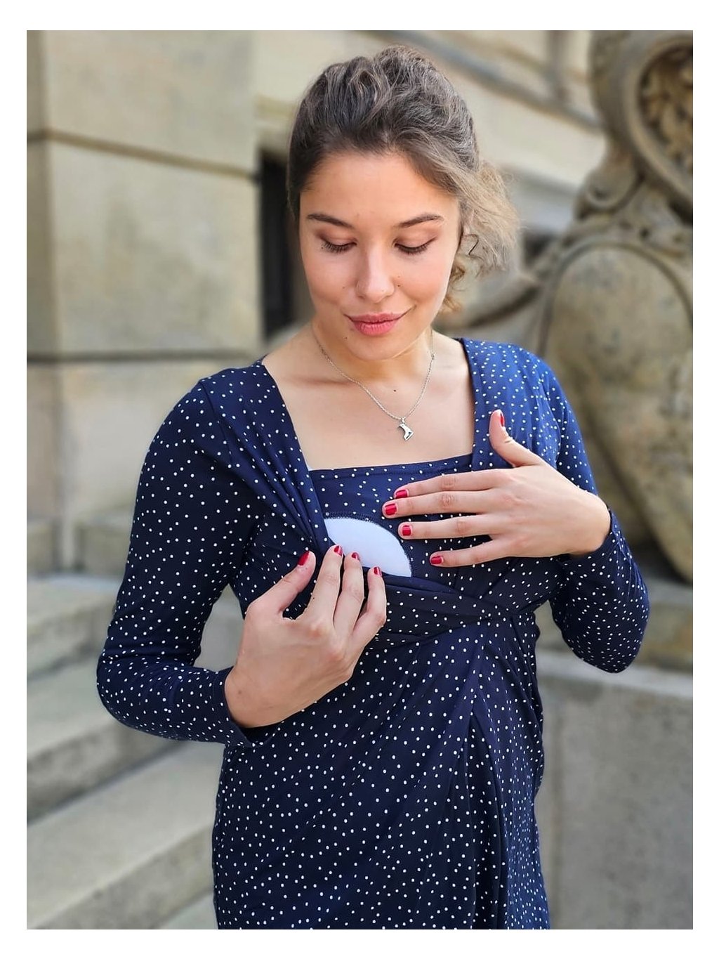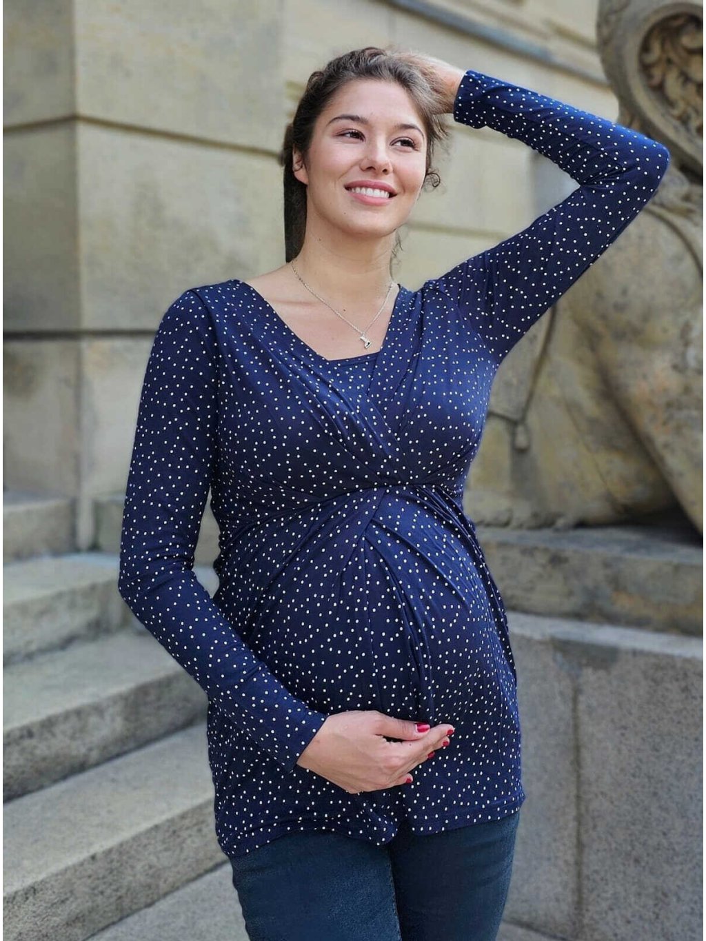 Těhotenská a kojicí halenka Gissa 3v1 v tmavě modré barvě s jemnými puntíky je navržená tak, aby vás provázela v každé fázi mateřství. V těhotenství se pohodlně přizpůsobí rostoucímu bříšku, po porodu umožní diskrétní kojení a poté ji můžete nosit jako běžnou halenku.