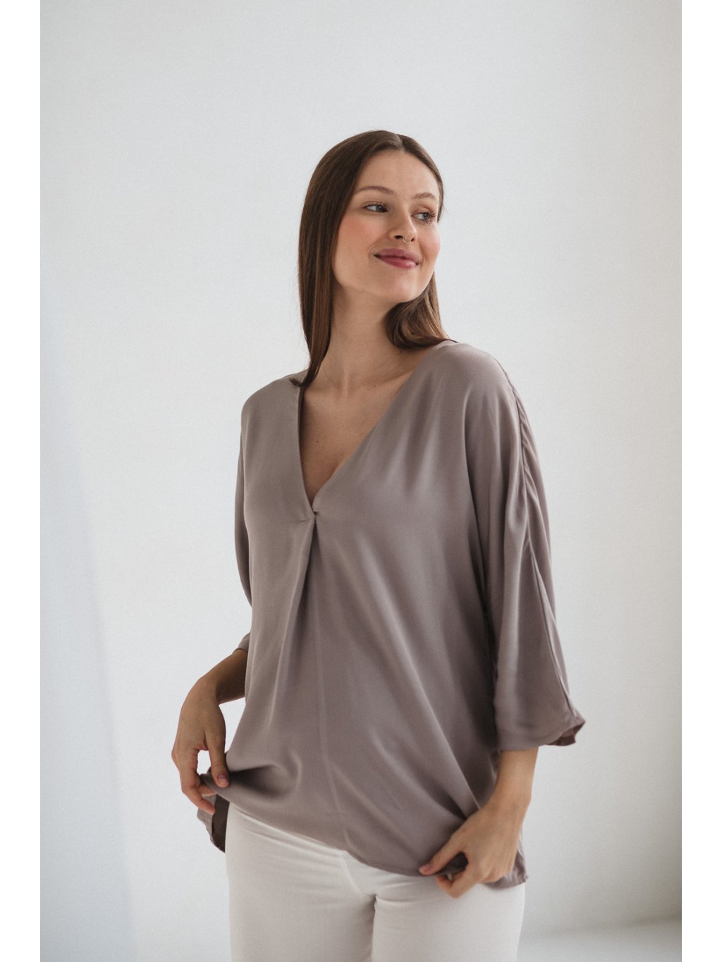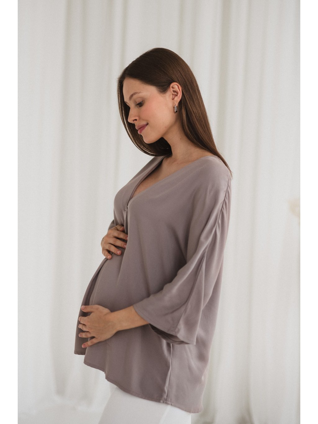 Široké kimonové rukávy a výstřih do V vytvářejí minimalistický, ženský design, který se hodí jak k ležérním outfitům, tak k formálnějším příležitostem. Výstřih do V umožňuje pohodlné a diskrétní kojení bez zipů a skrytých panelů – ideální doma, na procházce i v restauraci.