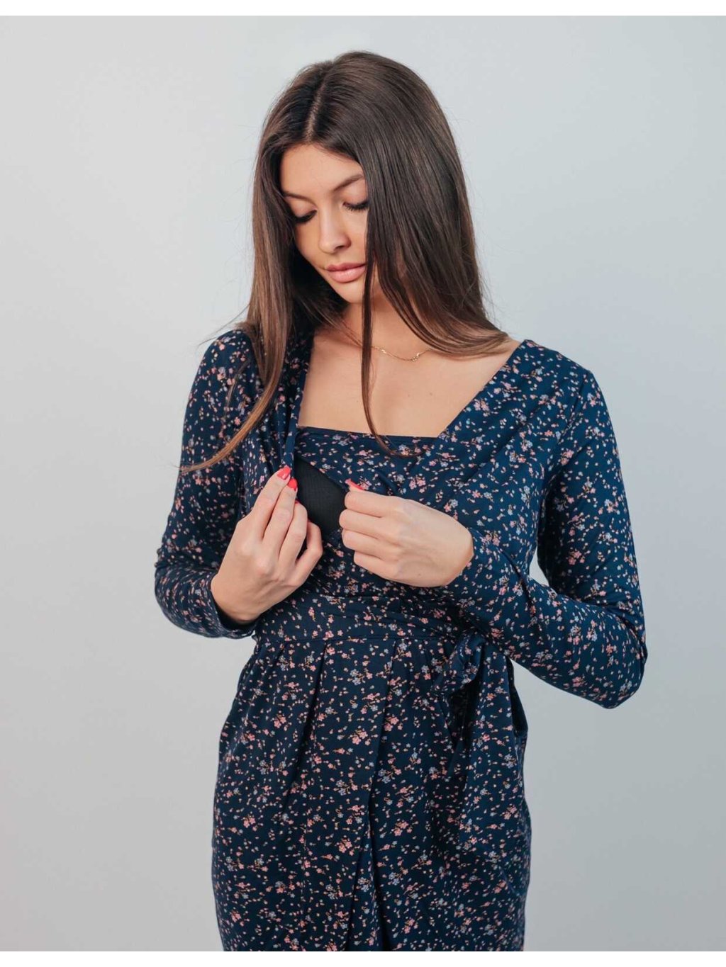 Elegantní těhotenské a kojící šaty 3v1 Blufi tmavě modré s kvítky dlouhý rukáv