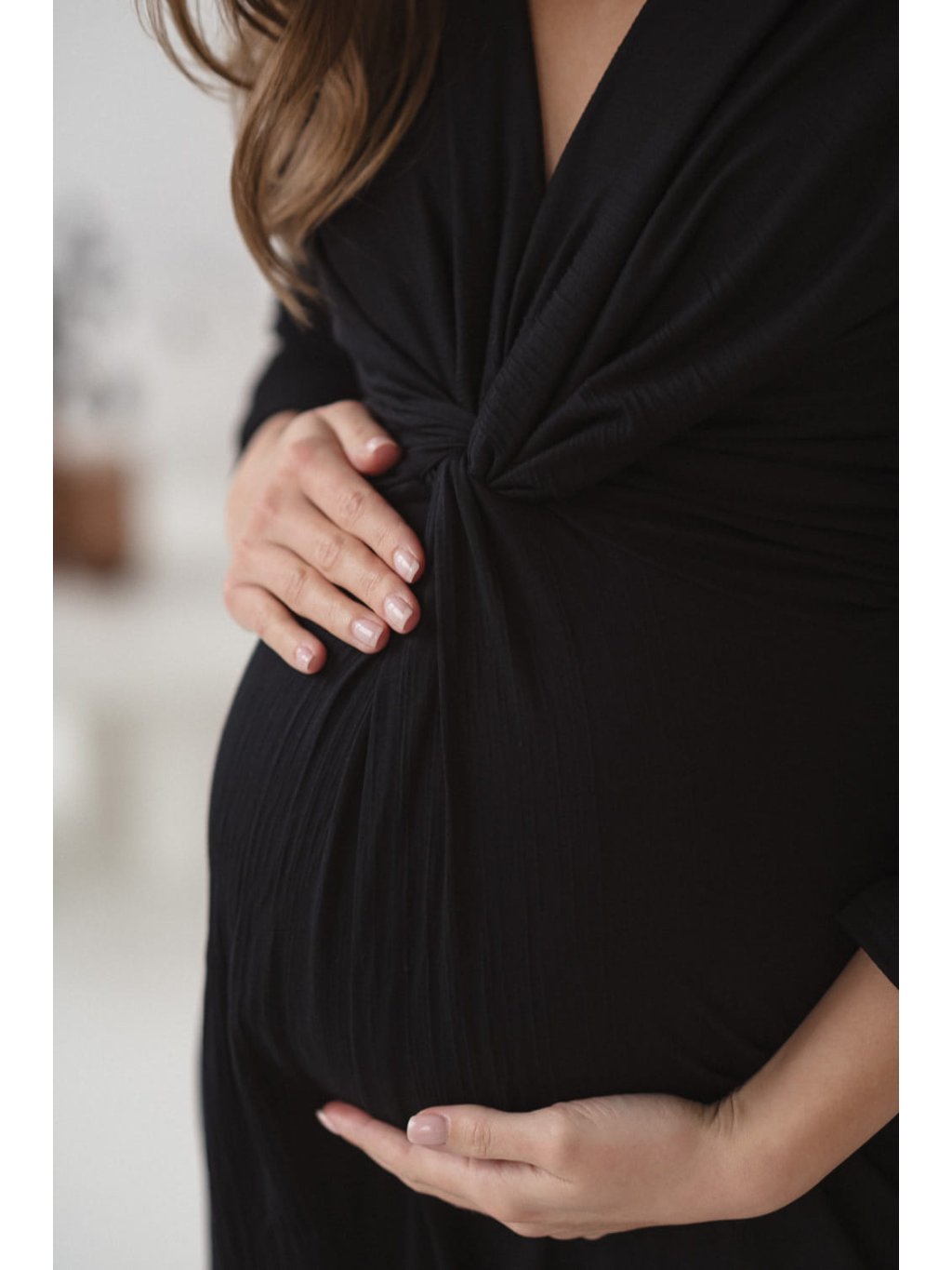 Těhotenské a kojicí šaty Loop v minimalistické černé barvě spojují ženský styl, praktičnost a maximální pohodlí. Ozdobný uzel vpředu a zadní uvazování vytvářejí lichotivou siluetu, která se přizpůsobí rostoucímu bříšku i postavě po porodu. Elastický výstřih umožňuje rychlé a diskrétní kojení, takže šaty využijete během těhotenství, při kojení i dlouho poté.