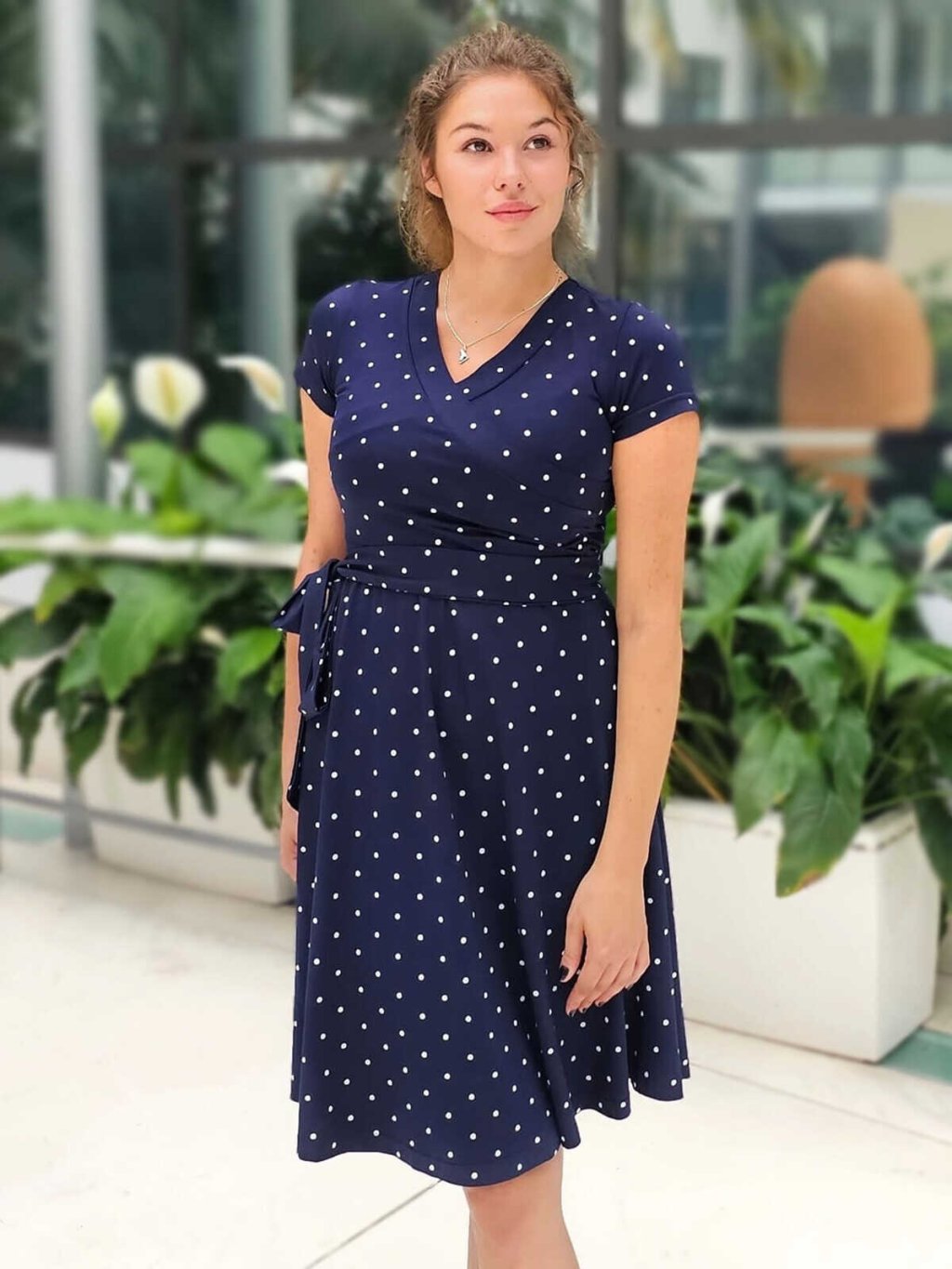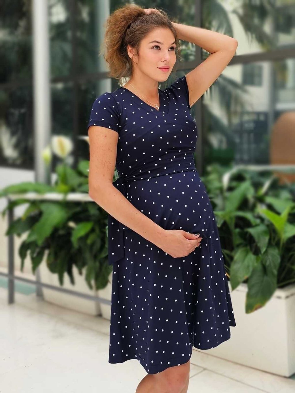 Elegantní těhotenské a kojící šaty s uvazováním 3v1 tmavě modré s puntíky