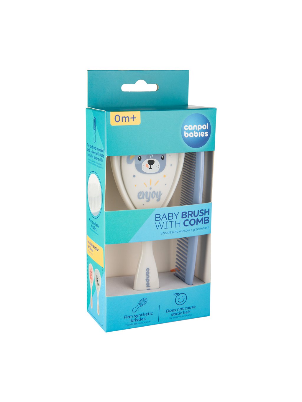 Kartáč na vlasy s hřebenem pro každodenní péči o vlasy děťátka. Hřeben má zaoblené zuby, které nedráždí citlivou pokožku. Kartáč s měkkými umělými štětinami jemně masíruje hlavu děťátka, aniž by mu elektrizoval vlasy. Sada je dostupná ve dvou variantách.