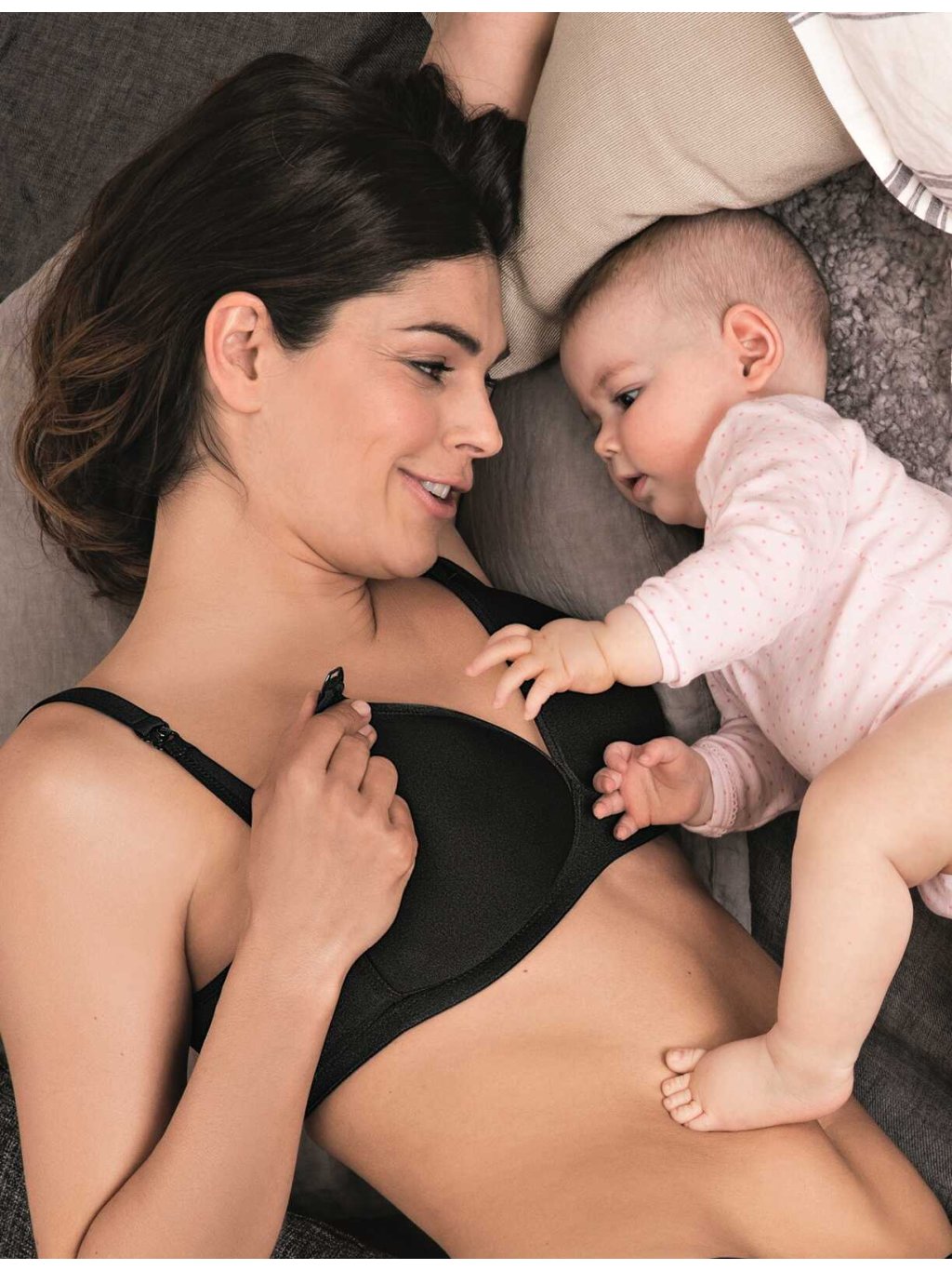 Maximální pohodlí při kojení! Elegantní, lehoučká a velmi pohodlná kojicí podprsenka bez kostic Miss Anita v černé barvě, s jemně vyztuženým košíčkem. Košíčky z prodyšného spacerového materiálu zajišťují příjemně chladnou teplotu těla. Díky trojúhelníkovému střihu, který lze velmi lehce doširoka otevřít, a systému Kwik Klip můžete své miminko snadno a pohodlně nakrmit.