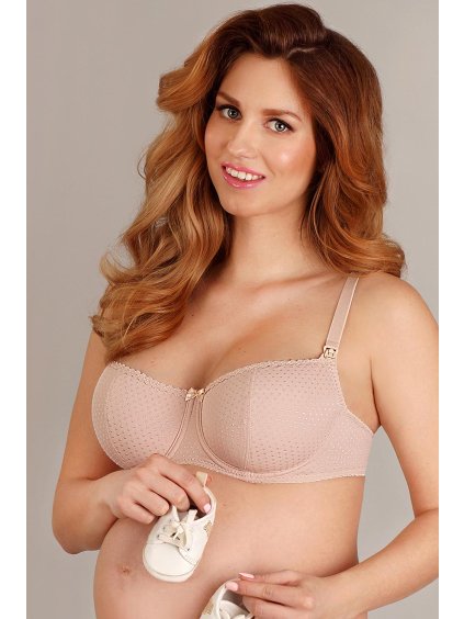 Krásná kojící podprsenka z mikrovlákna v béžové barvě, s drobnými puntíky Okouzlující vzhled podprsenky doplňuje jemná krajka a saténová mašlička...