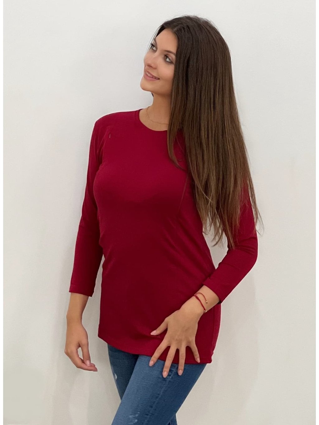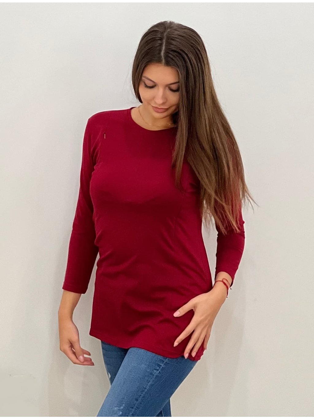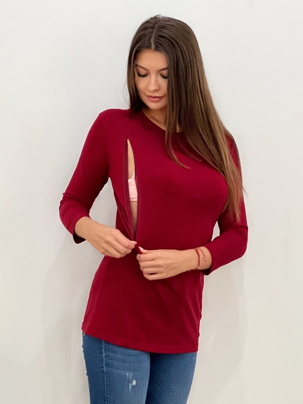 Kojicí tričko Loren z kolekce Mama L’amour v elegantní bordó barvě je navržené pro pohodlí, diskrétnost a ženský styl. Skryté zipy umožňují snadné kojení kdykoli a kdekoli – bez nutnosti se odhalovat. Zipy se otevírají směrem dolů, takže tričko zvládnete obsloužit jednou rukou, i když držíte miminko.