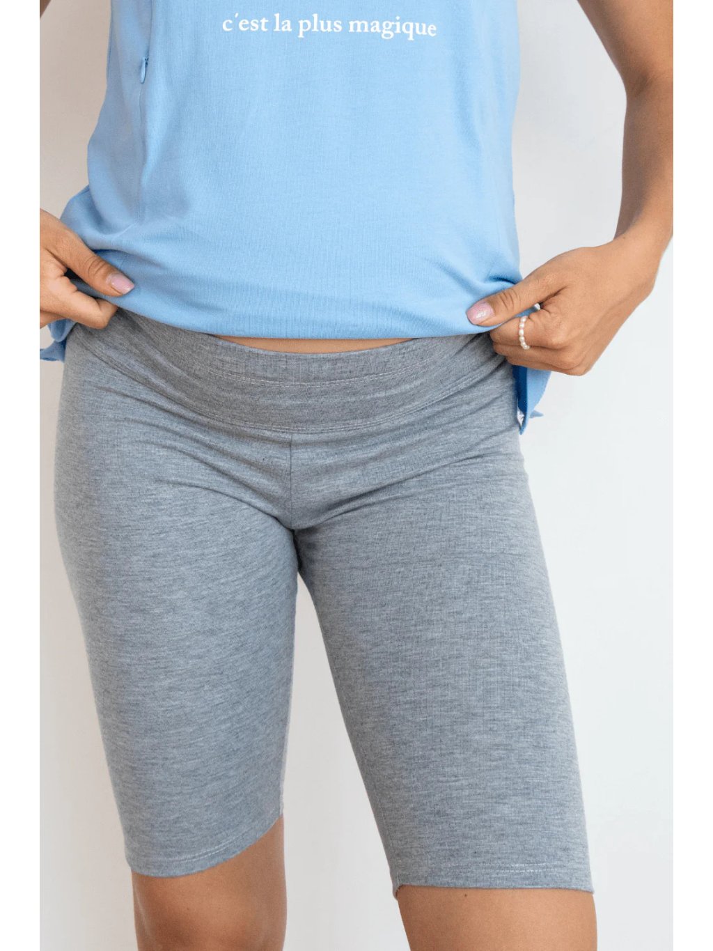 Krátké těhotenské legíny – šedé, pohodlné a elastické