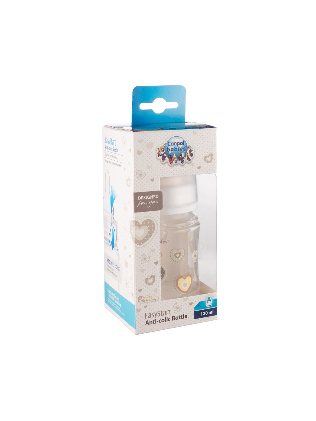 Tvarovaná polypropylénová láhev EasyStart s potiskem Newborn baby o objemu 120ml, která se velmi dobře drží při krmení. Široké hrdlo usnadňuje plnění a mytí, výrazná stupnice pak kontrolu dítětem vypitého množství. Obsahuje protikolikovou savičku 0-3m, která svým tvarem co nejvíc připomíná matčin prs. Umožňuje tak dítě kojit i krmit z láhve zároveň. V láhvi uzavřené těsnícím diskem můžete pokrm zmrazovat nebo transportovat bez rizika vylití. Láhev neobsahuje BPA.