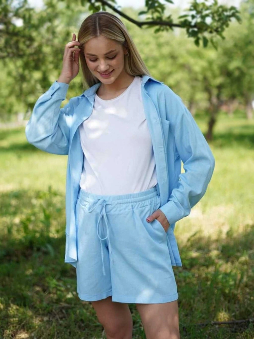 Tento letní těhotenský komplet ve světle modré barvě je ušitý z lehké a prodyšné 100% viskózy, která je příjemná na těle i v horkých dnech. Volná halenka s límečkem a rozepínáním na knoflíky poskytuje maximální pohodlí a díky svému střihu se přirozeně přizpůsobí rostoucímu bříšku. Jemně splývá, neobepíná a vytváří krásně ženskou siluetu.