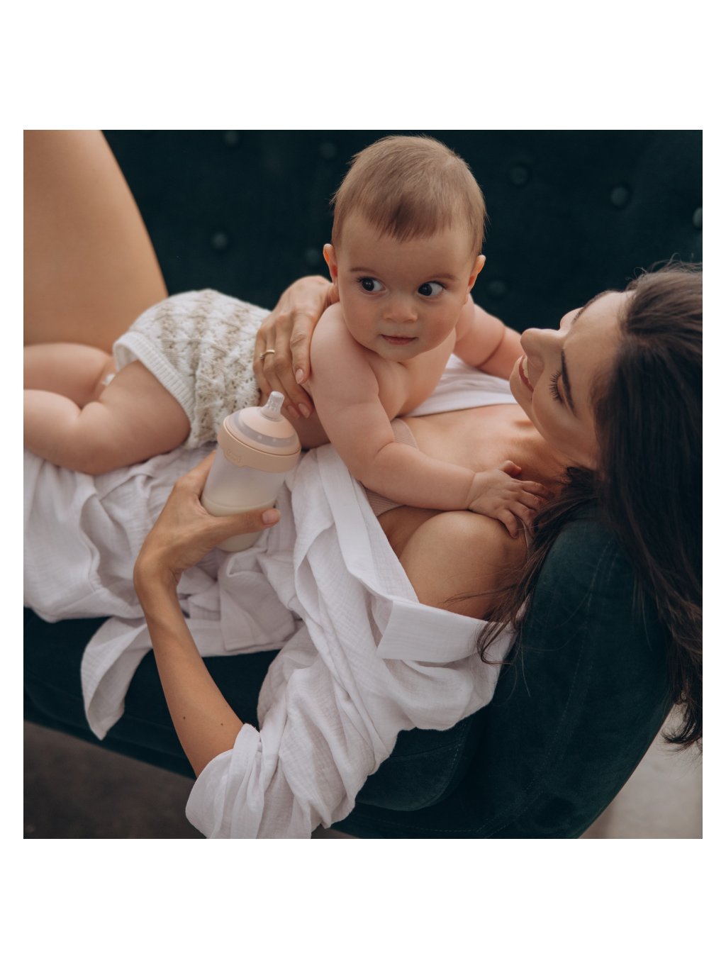 Široký, profilovaný tvar po vzoru mamčiných prsou a dokonalé proporce zajišťují, že ústa dítěte jsou umístěna ve správném úhlu, rty jsou pevně sevřené a dítě může volně dýchat nosem, což snižuje riziko vzniku koliky.