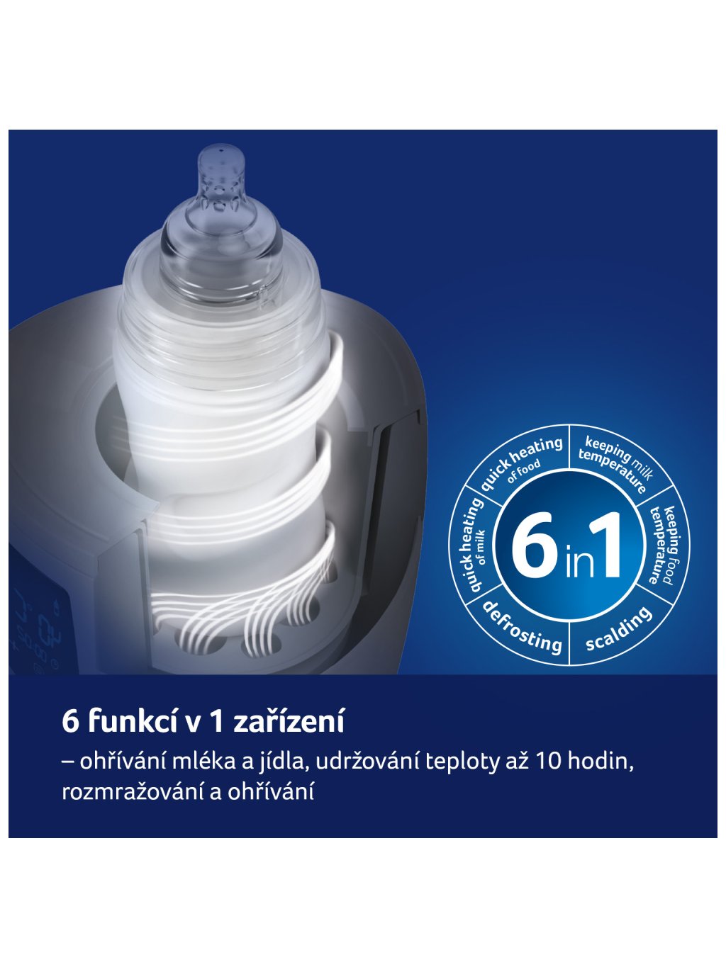 6 funkcí v 1 - ohřívá, udržuje teplotu, rozmrazuje a sterilizuje párou.