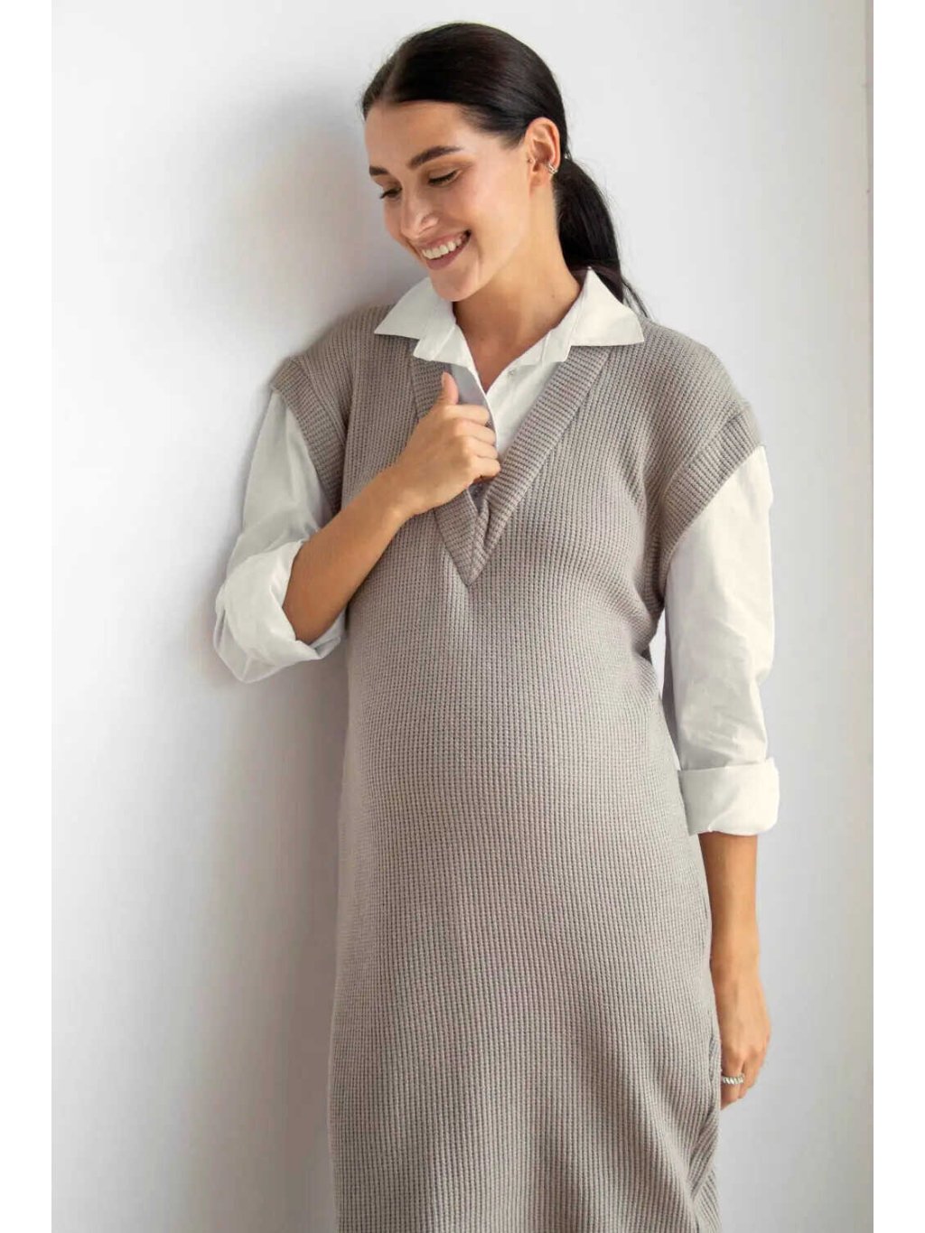 Tyto béžové svetrové těhotenské šaty s integrovanou košilí spojují jednoduchost, pohodlí a upravený vzhled v jednom kousku. Pletený úplet je měkký, příjemný na těle a díky své pružnosti se krásně přizpůsobí rostoucímu bříšku. Všitá košile s límečkem dodává šatům čistý, elegantní vzhled, který působí jako dokonale sladěné vrstvení.