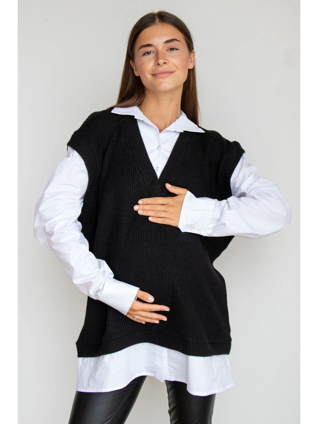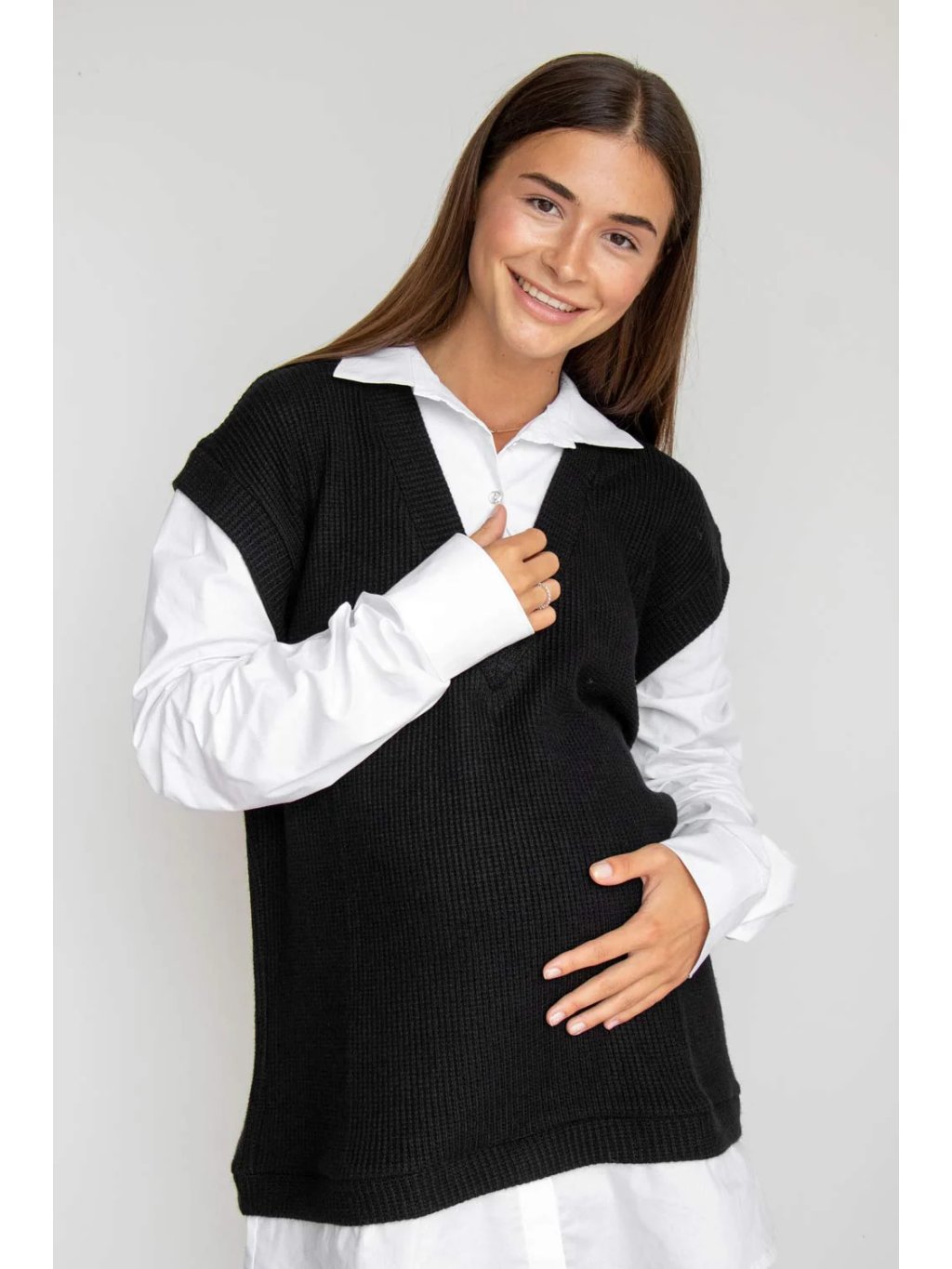 Tento těhotenský komplet 2v1 kombinuje měkký pletený svetr bez rukávů s bílou košilí a vytváří elegantní vrstvený vzhled bez nutnosti kombinovat více kusů oblečení. Jehličkovitá struktura úpletu působí klasicky, ale díky modernímu střihu a V‑výstřihu je outfit svěží a nadčasový.