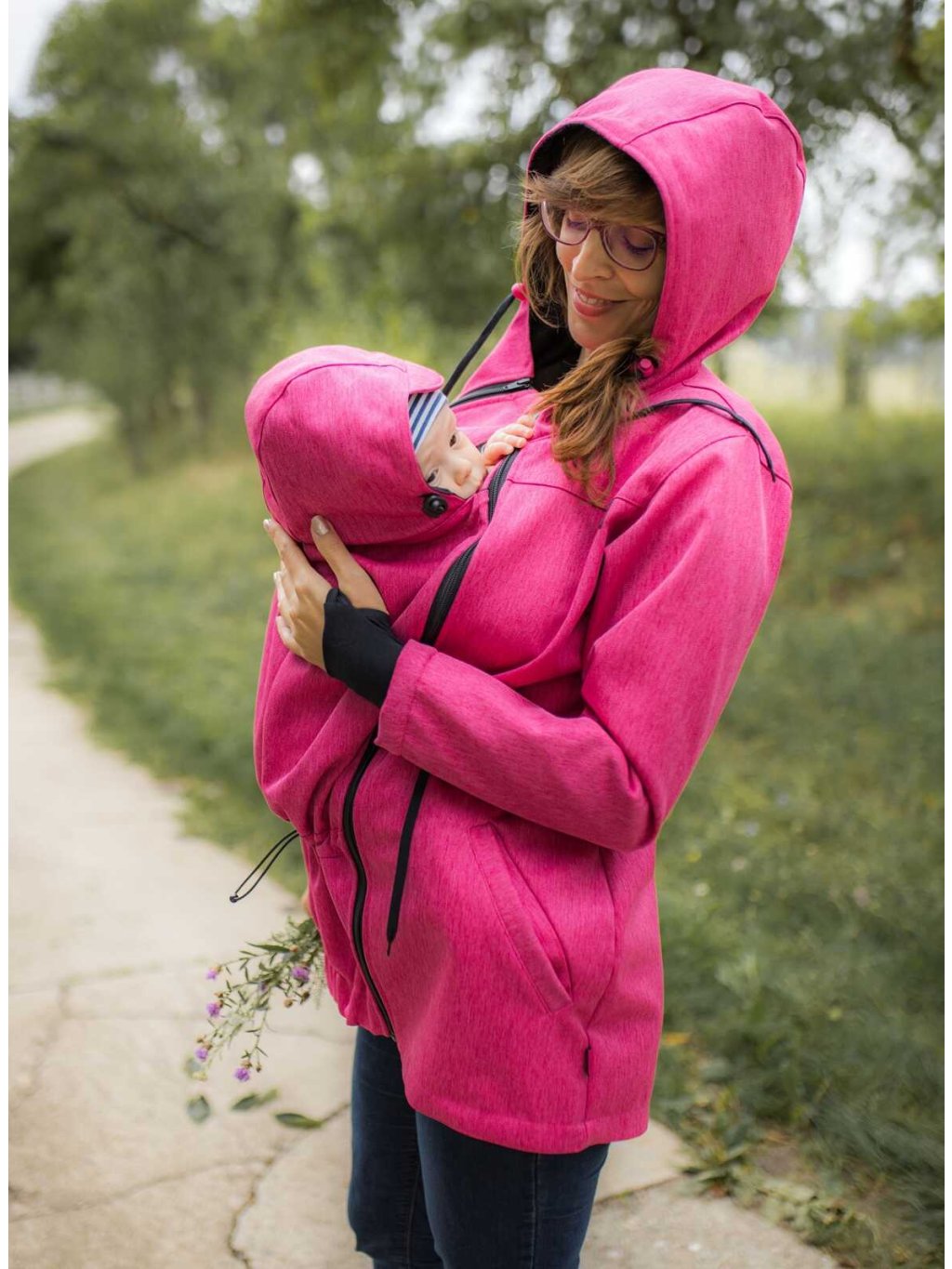 Stylový kabát pro těhotenství, nošení miminka i běžné dny Krtásný softshellový nosící kabát 2v1 v malinové barvě s ornamentálním vzorem....