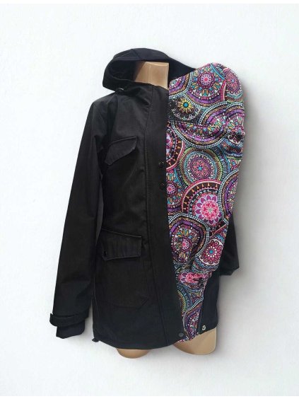 Stylový kabát pro těhotenství, nošení miminka i běžné dny Krásný softshellový nosící kabát 2v1 v černo růžové barvě s mandalami a unikátními...