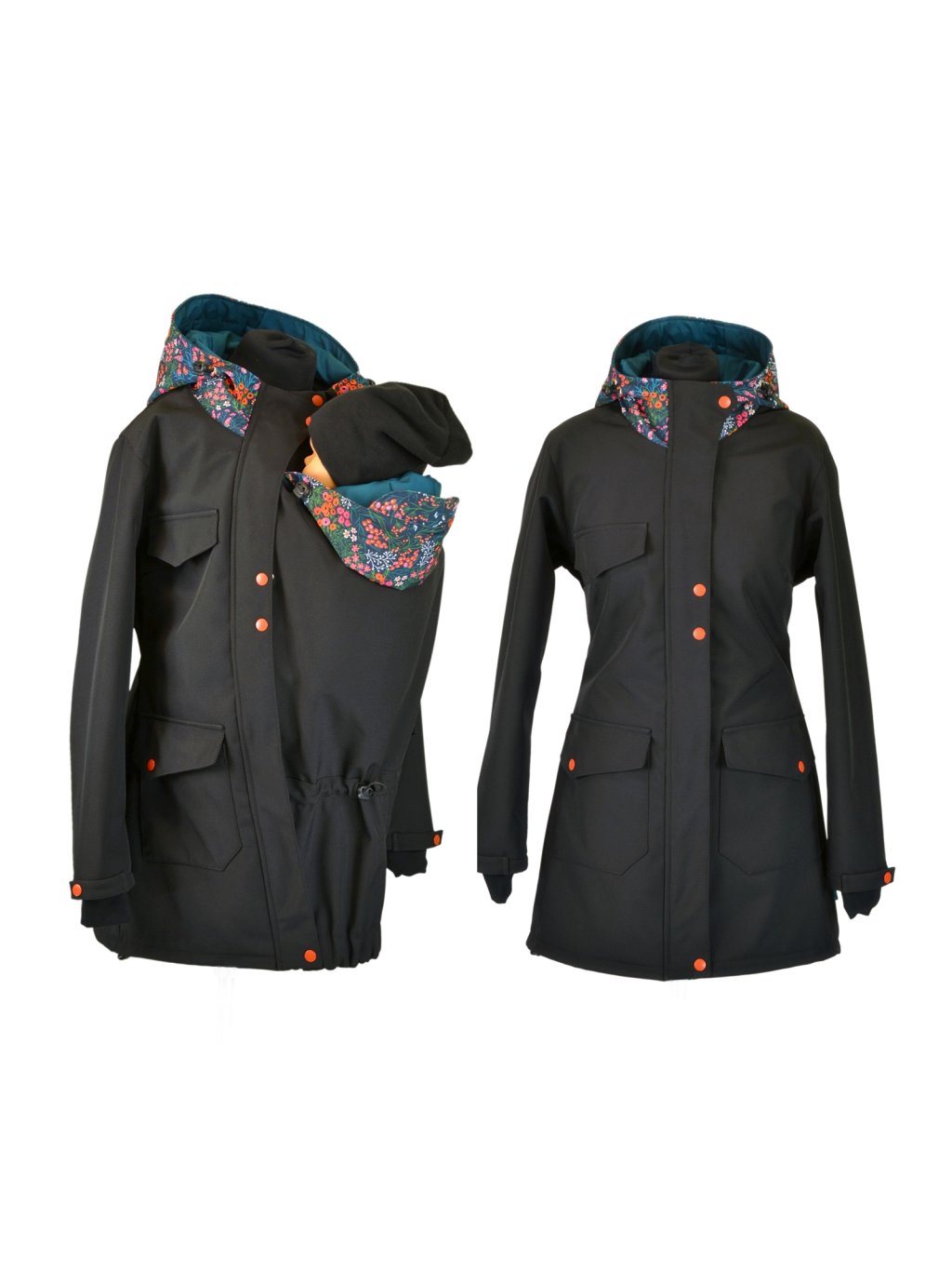 Stylový kabát pro těhotenství, nošení miminka i běžné dny Elegantní softshellový nosící kabát 2v1 v černé barvě s jemným motivem lapačů snů. Kabát...