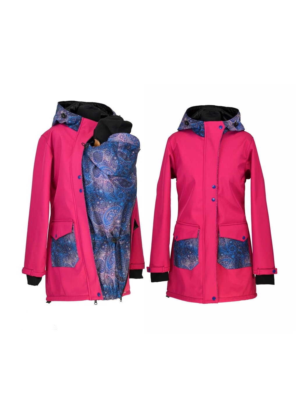Stylový kabát pro těhotenství, nošení miminka i běžné dny Krtásný softshellový nosící kabát 2v1 v malinové barvě s ornamentálním vzorem....
