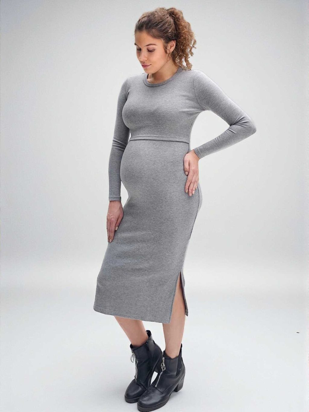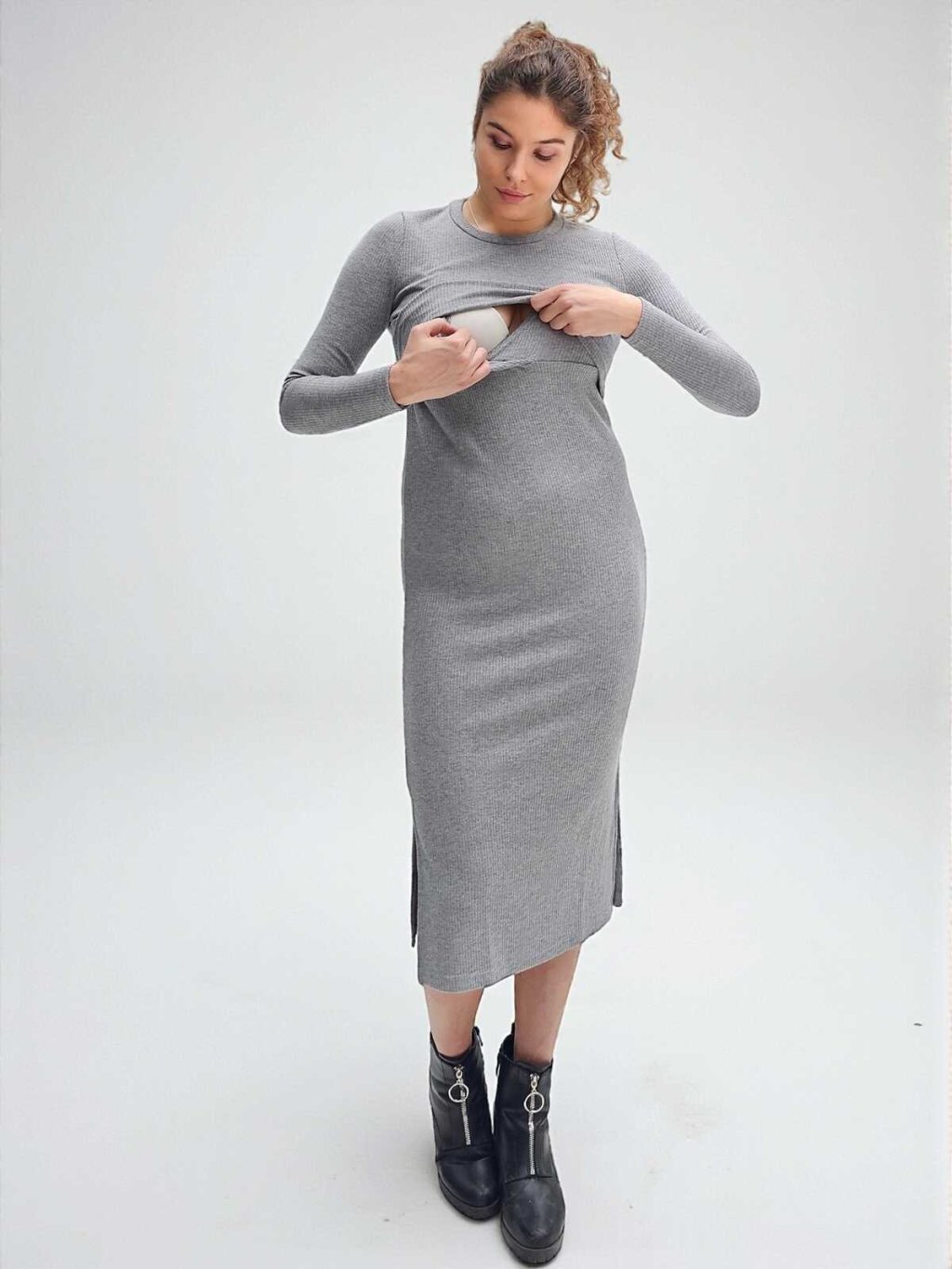 Svetrové těhotenské a kojicí šaty Amalya v šedém odstínu jsou navržené pro pohodlí, styl a funkčnost v každé fázi mateřství. Šaty jsou vyrobené z extra příjemné žebrované směsi, která je měkká a pružná. Jednodílný střih s dlouhým rukávem se krásně přizpůsobí rostoucímu bříšku a zůstává pohodlný i po porodu. Boční rozparek dodává šatům elegantní detail a zároveň umožňuje volnost pohybu při chůzi, sezení i kojení.