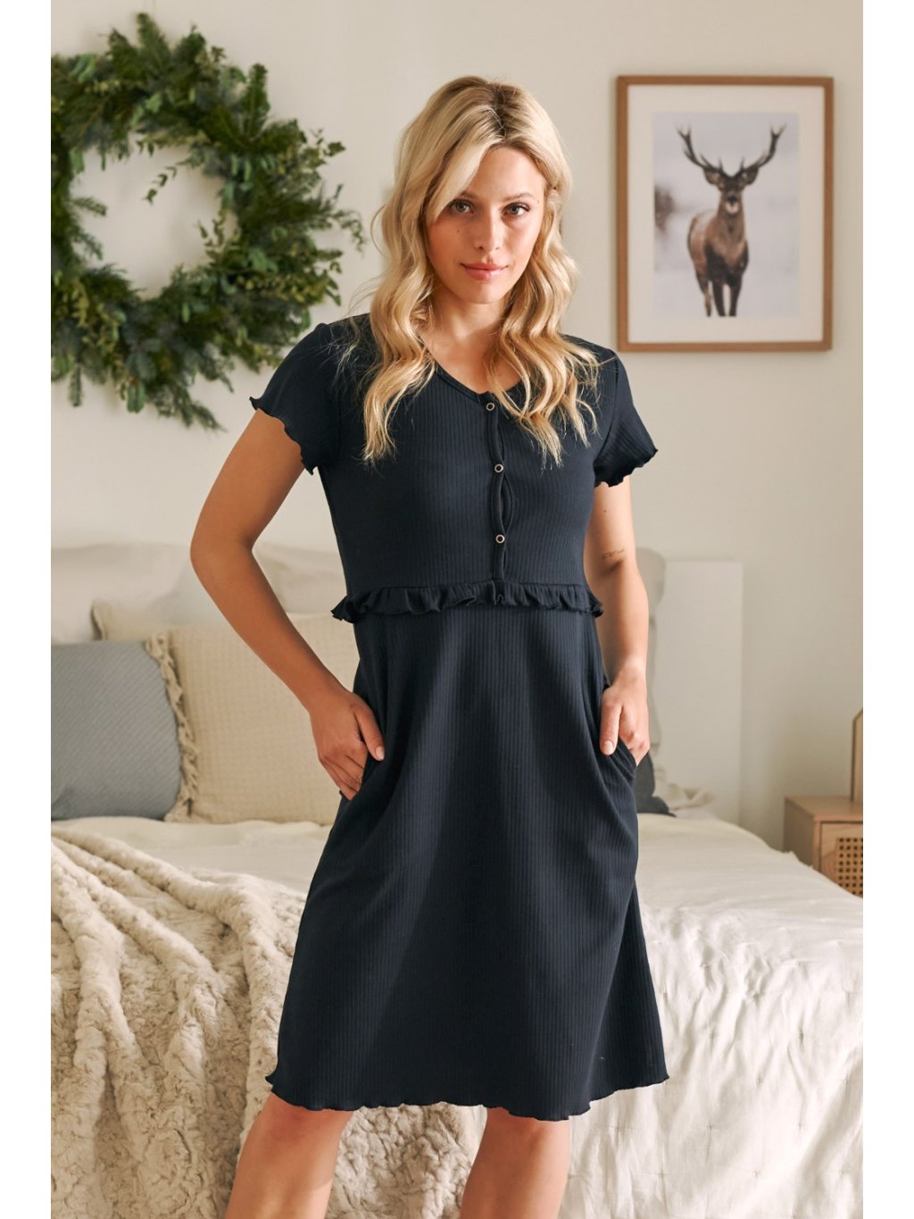 Tuto těhotenskou a kojicí noční košili z žebrované bavlny doporučujeme vybírat podle své běžné velikosti – pružný úplet se krásně přizpůsobí postavě a pohodlně sedí v každé fázi mateřství.