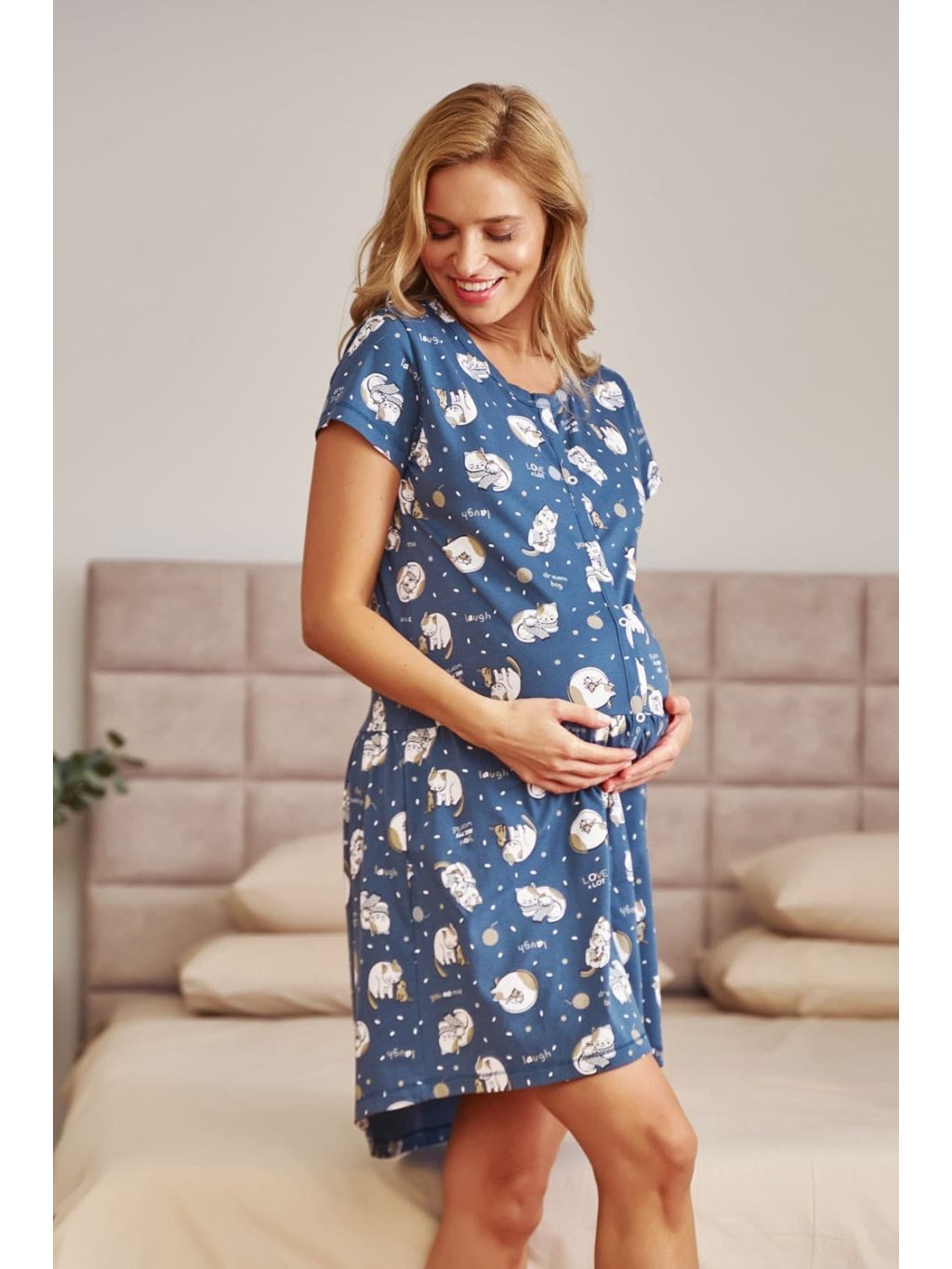 Těhotenská a kojicí noční košilka – modrá s kočičkami, ideální do porodnice