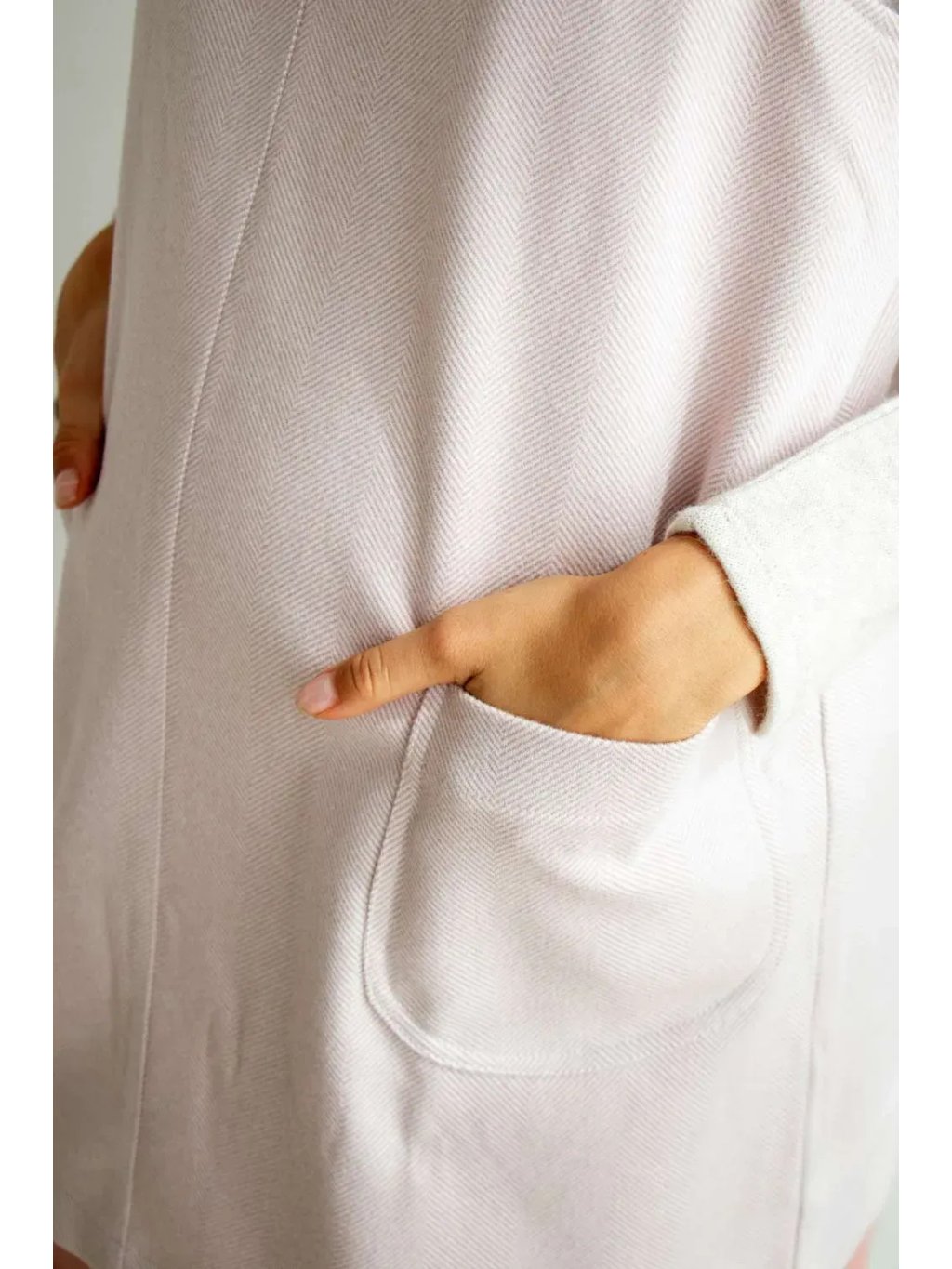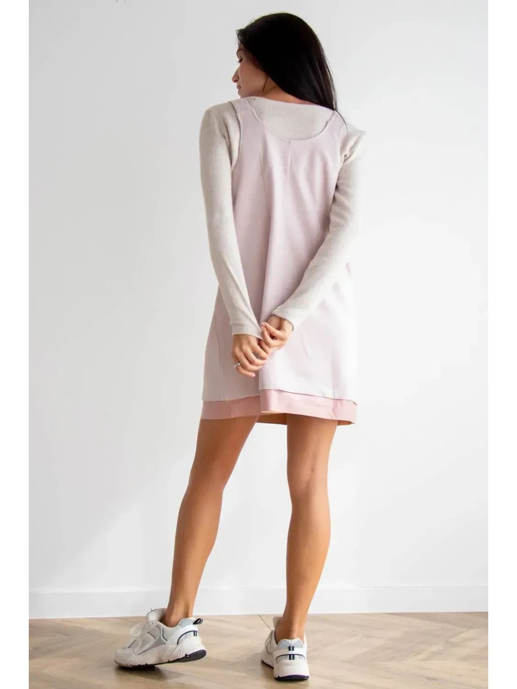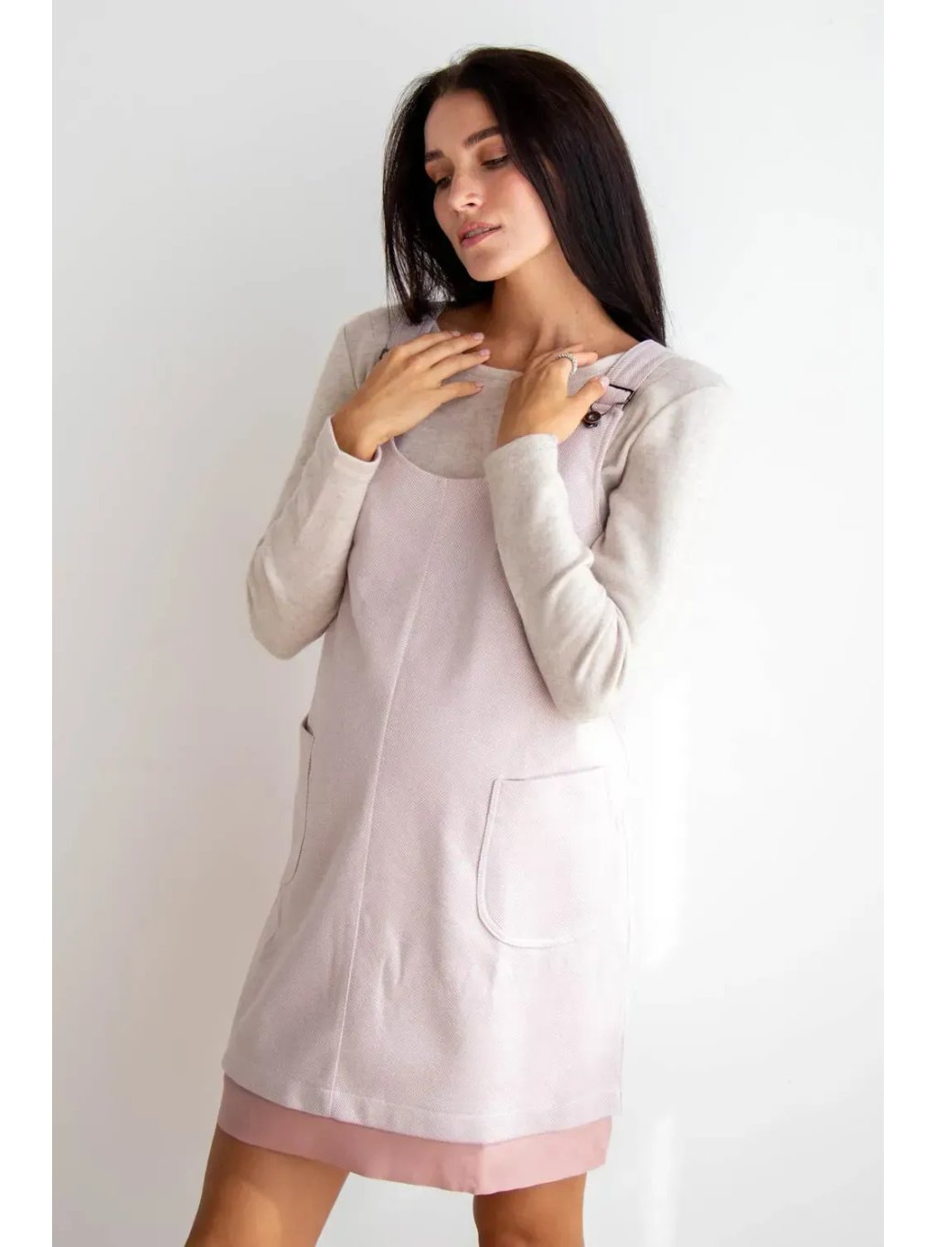 Stylová těhotenská šatovka s laclem v jemné pudrově růžové barvě je navržená tak, aby seděla v každé fázi těhotenství i po porodu. Volný lichoběžníkový střih vytváří vyváženou siluetu a neomezuje v pohybu. Nastavitelná ramínka s odepínacími klipy na kojení umožňují přizpůsobení podle výšky i obvodu hrudníku a zároveň usnadňují kojení po narození miminka.