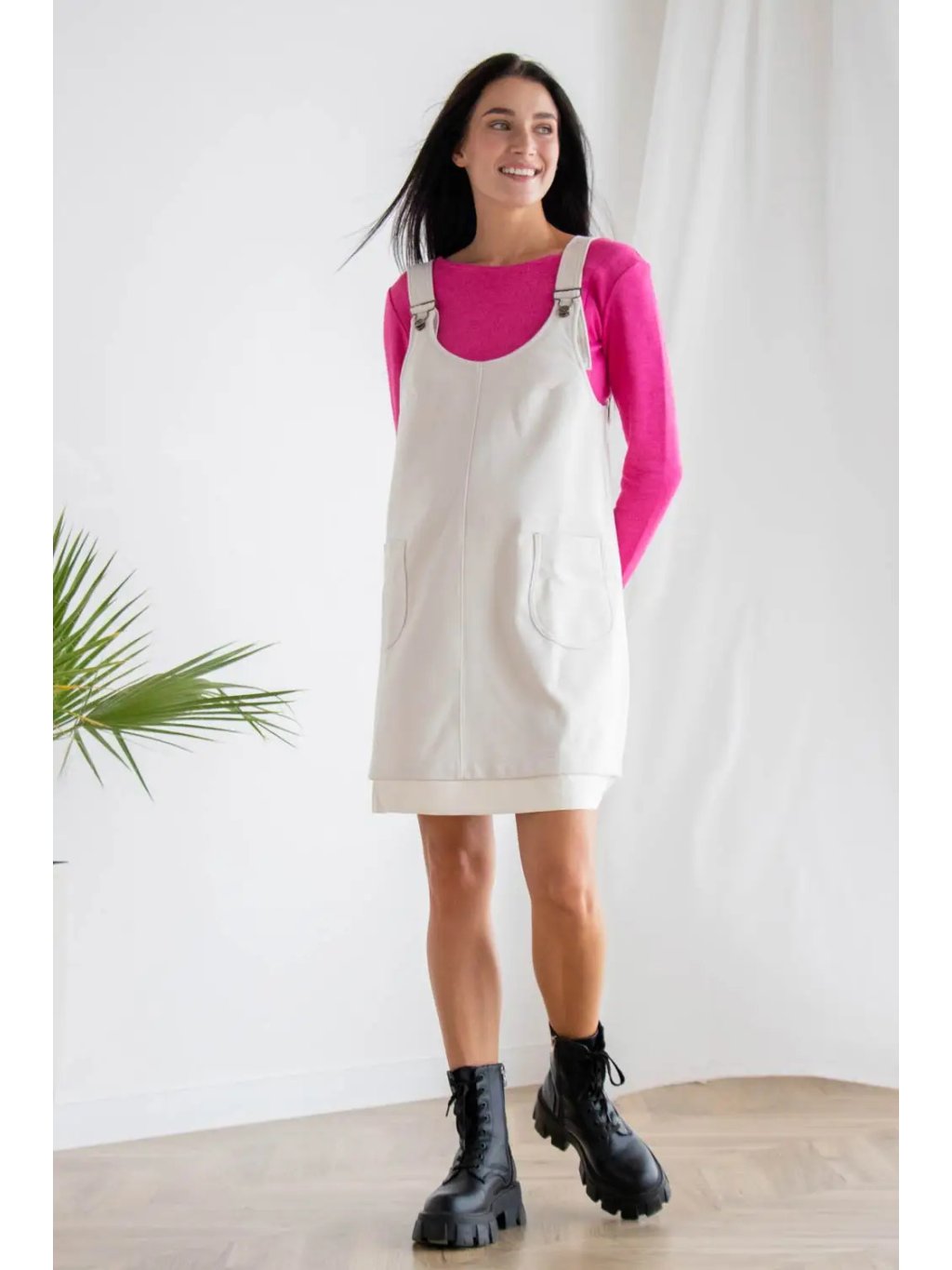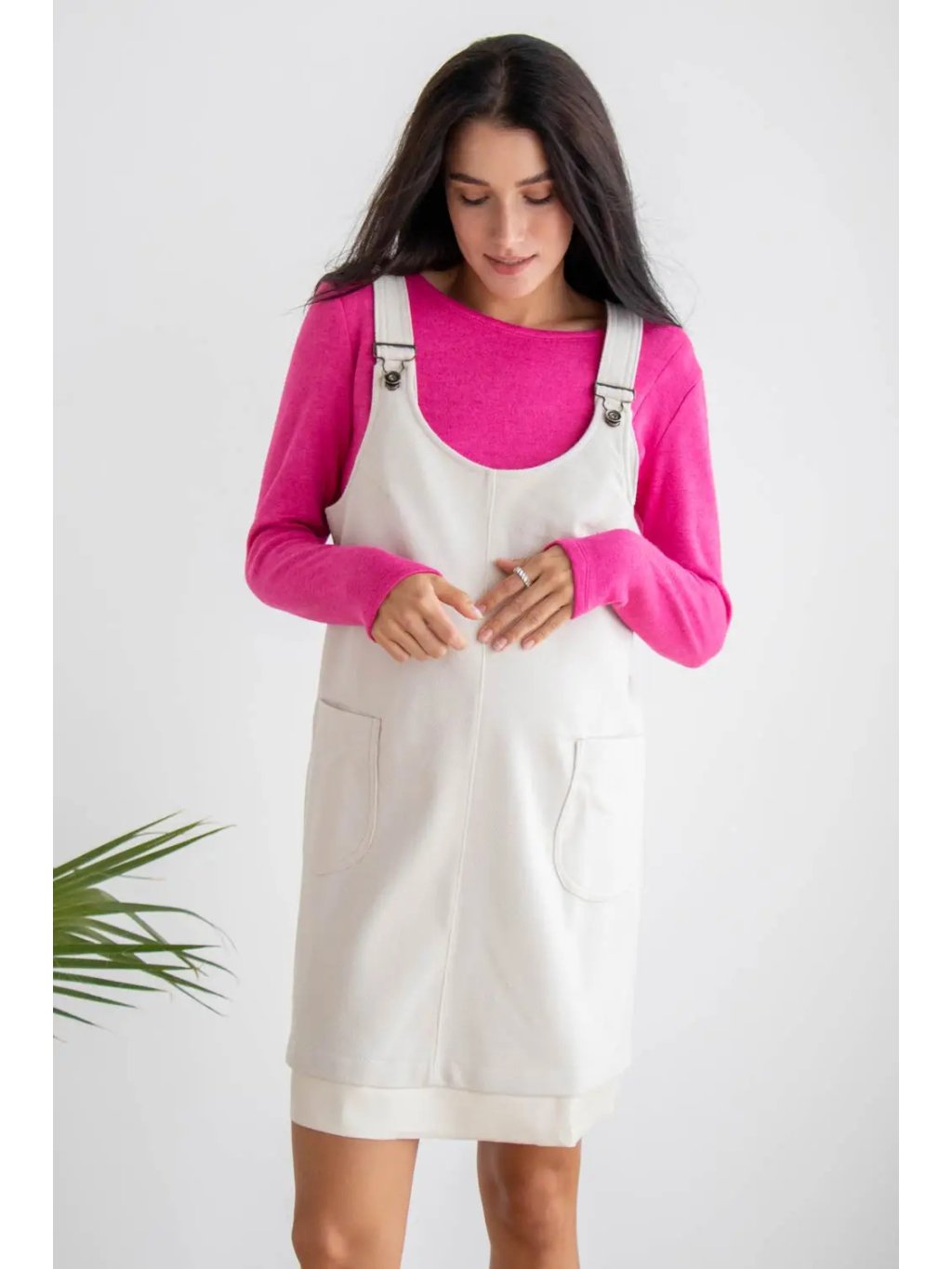 Stylová těhotenská šatovka s laclem ve světle béžové barvě je navržená tak, aby seděla v každé fázi těhotenství i po porodu. Volný lichoběžníkový střih vytváří vyváženou siluetu a neomezuje v pohybu. Nastavitelná ramínka s odepínacími klipy na kojení umožňují přizpůsobení podle výšky i obvodu hrudníku a zároveň usnadňují kojení po porodu