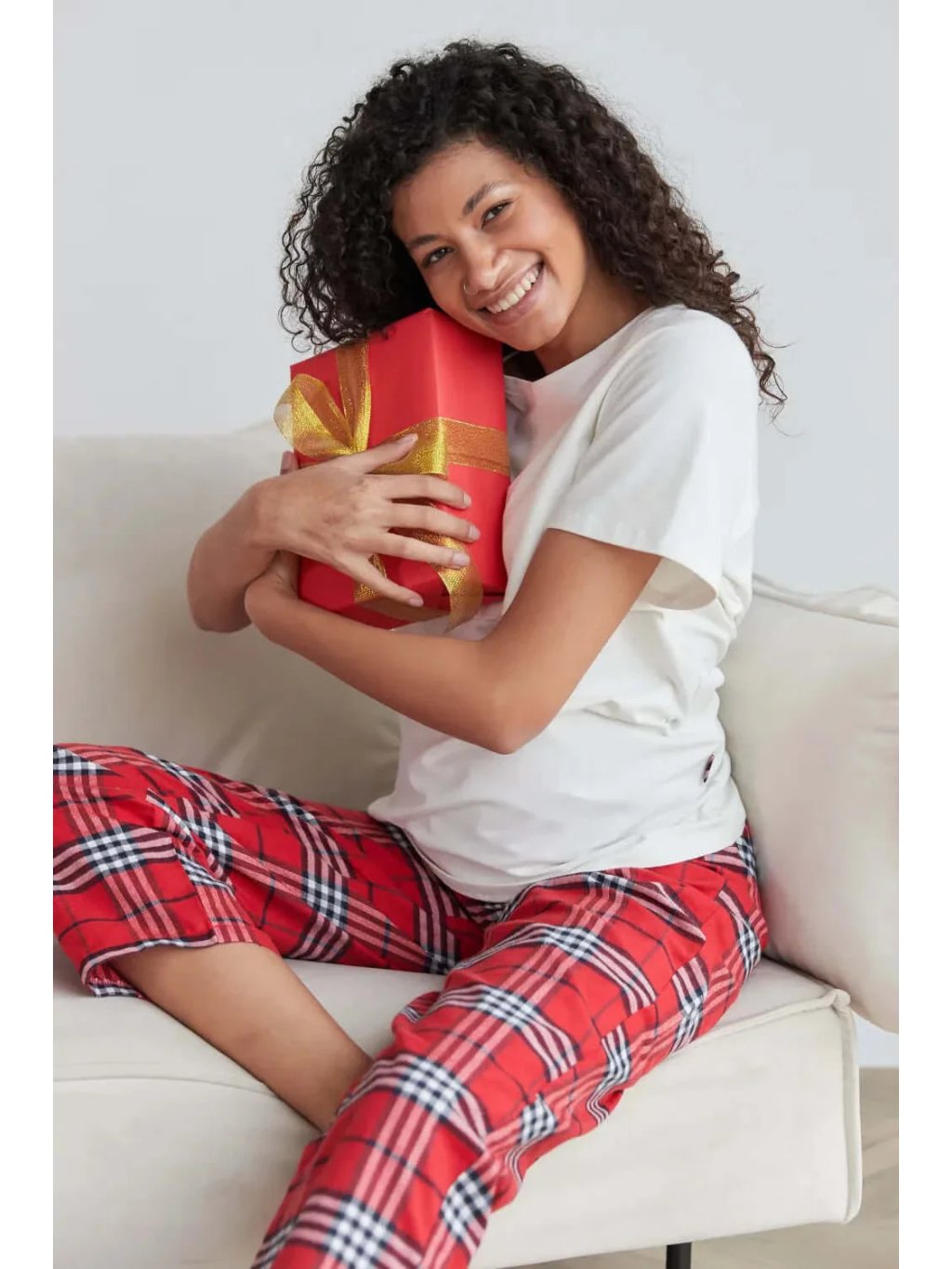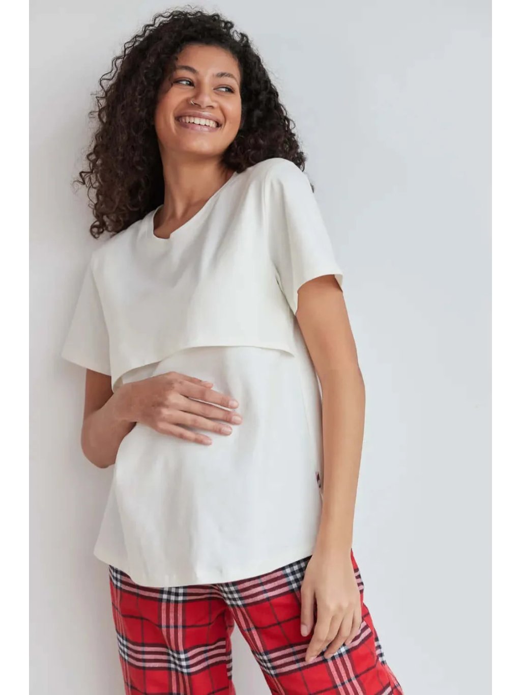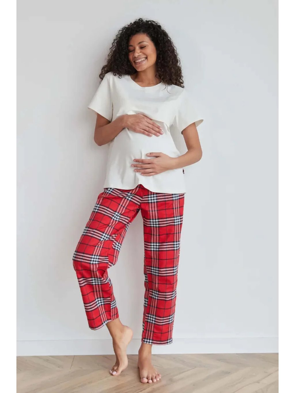 Těhotenské a kojicí pyžamo – bílé tričko a červené kostkované kalhoty