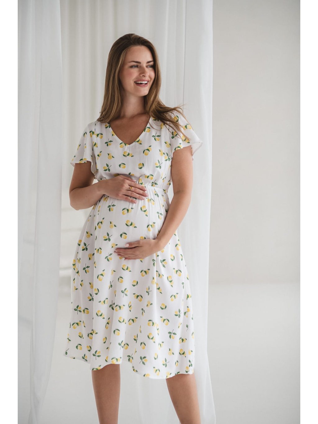 Těhotenské a kojící šaty 3v1 Lovely MIDI bílé s citrónovým vzorem
