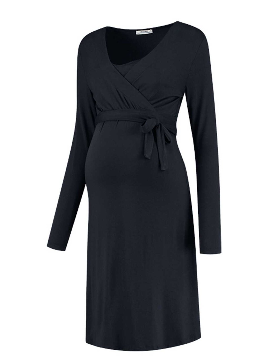 Těhotenské a kojící šaty s uvazováním 3v1 Tencel tmavě modré dlouhý rukáv