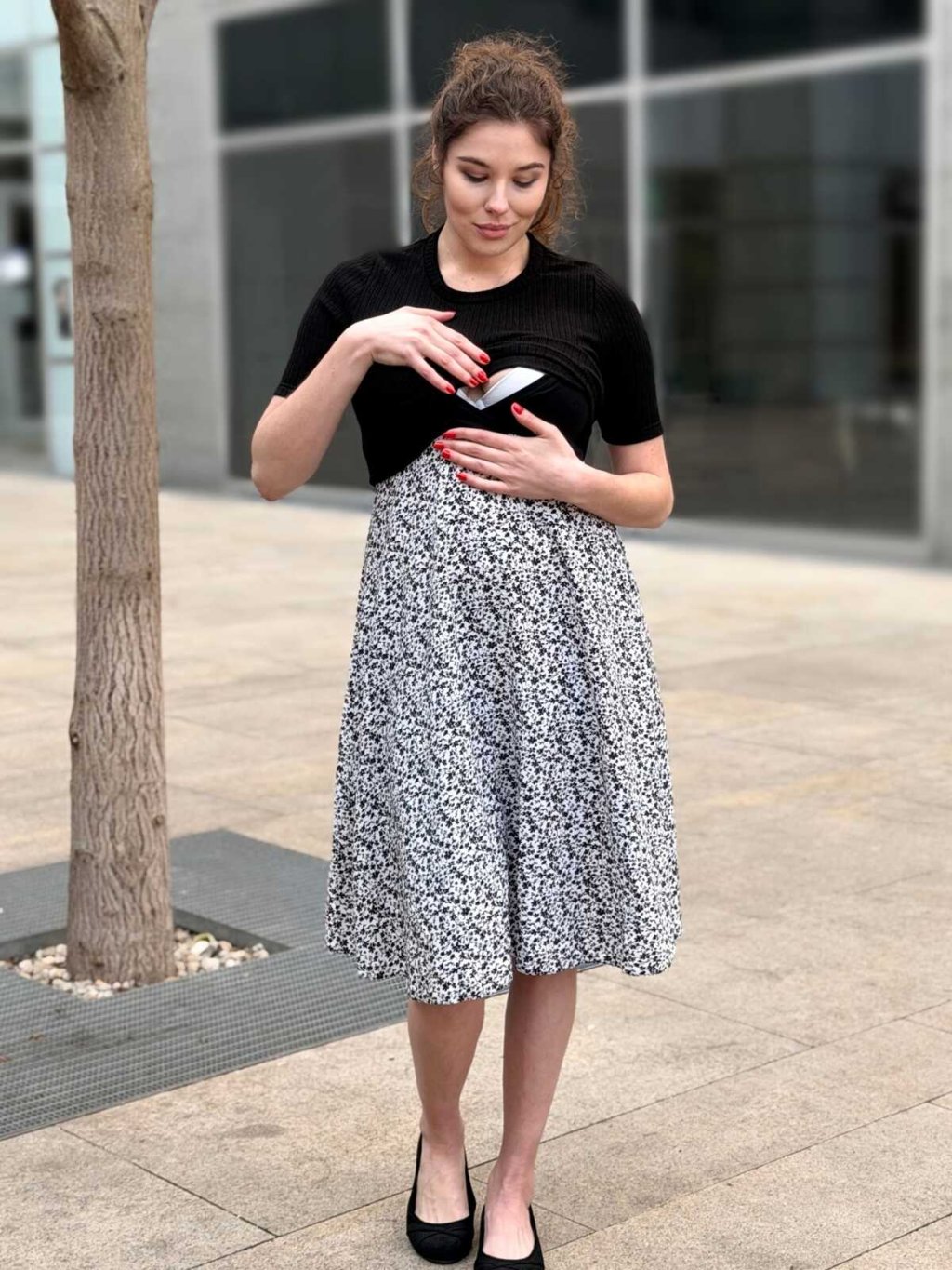 Těhotenské a kojicí šaty Annelies 3v1 v elegantní černobílé kombinaci s drobnými kvítky jsou navržené tak, aby vás provázely celým obdobím mateřství. Pružný žebrovaný úpletový top s krátkým rukávem se krásně přizpůsobí měnící se postavě a lehká, volná sukně poskytne dostatek prostoru i pro rostoucí bříško. Díky lehčímu rukávu jsou ideální na teplejší dny i vrstvení. Celek působí jemně, pohodlně a přirozeně – přesně tak, jak se chcete cítit každý den.
