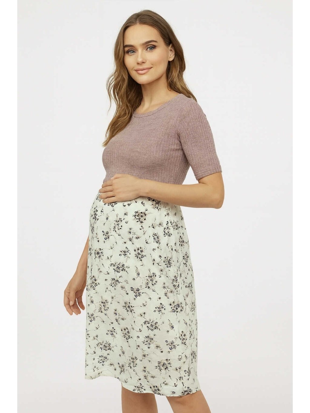 Těhotenské a kojicí šaty Annelies 3v1 v kombinaci hnědé taupe a bílé květinové sukně jsou navržené tak, aby se přirozeně přizpůsobily měnící se postavě i každodennímu rytmu. Pružný žebrovaný úpletový top s krátkým rukávem a lehká, volná sukně se krásně poddají rostoucímu bříšku a nabídnou pohodlí po celý den. Po narození miminka se z nich stanou praktické šaty na kojení – pod horní vrstvou je skrytý otvor, který umožňuje rychlé a velmi diskrétní kojení v jakékoliv situaci. Top lze celý odepnout, prát samostatně nebo kombinovat s jinými úplety a svetry.