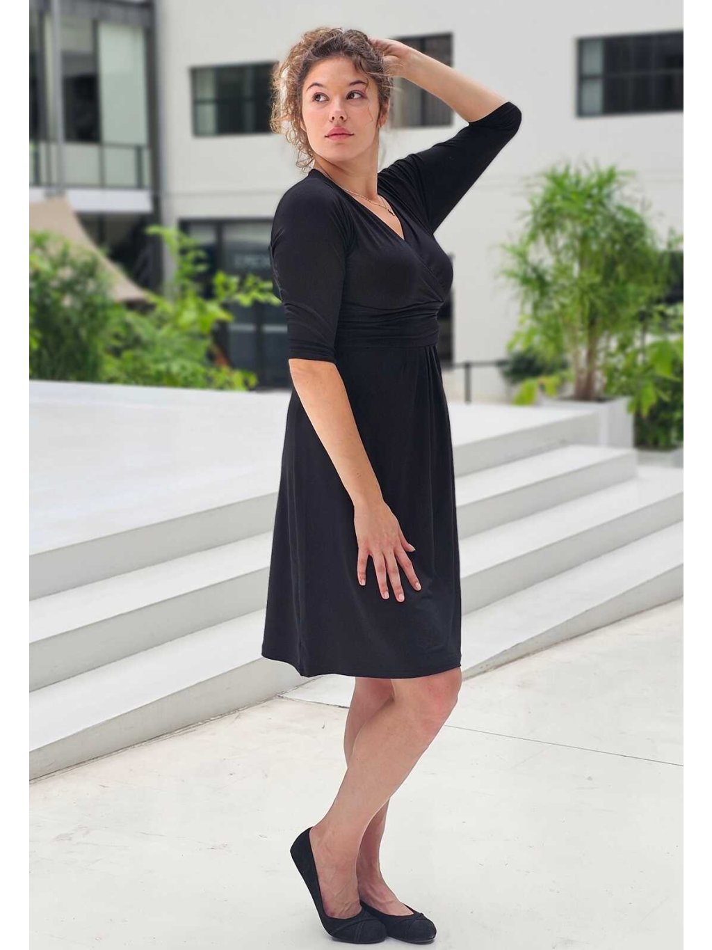 Černá barva působí elegantně, nadčasově a snadno se kombinuje s doplňky, takže šaty využijete na běžné nošení, pracovní schůzky i slavnostní příležitosti. Díky ¾ rukávům se šaty pohodlně nosí v každém ročním období. Součástí kolekce slow fashion - můžete je nosit i po skončení mateřství.