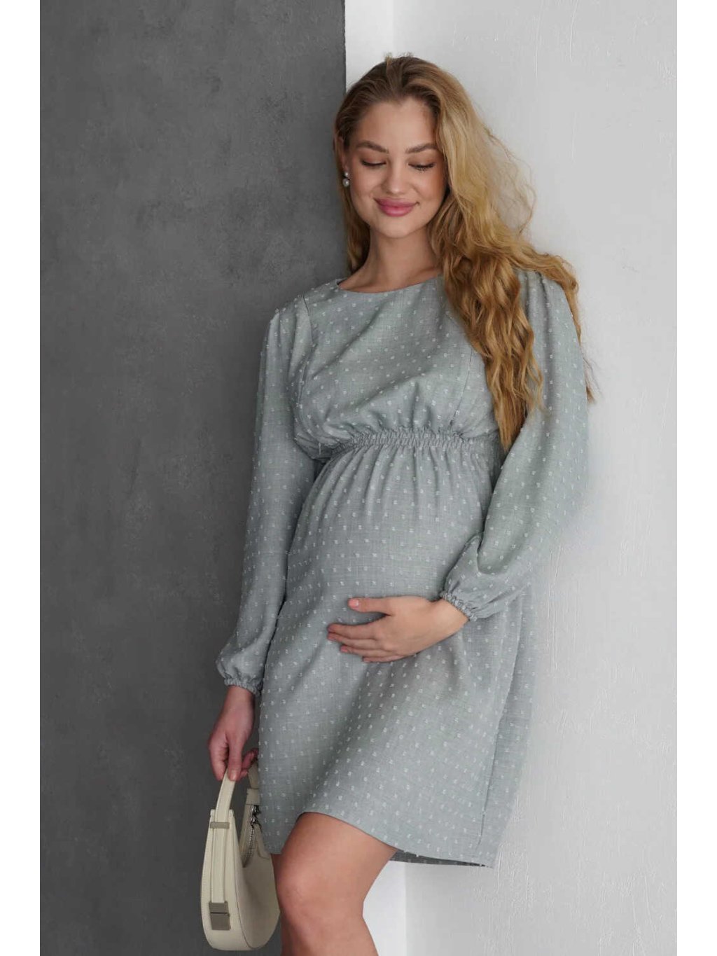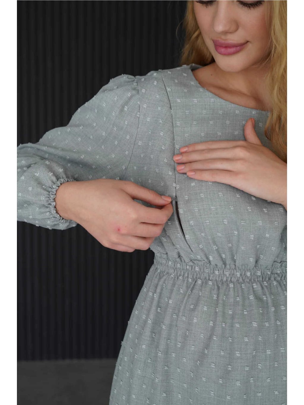 Šaty jsou ušité z lehkého materiálu s drobně strukturovaným vzorem, který dodává celému modelu jemnost a eleganci. Široké rukávy zakončené gumičkou působí vzdušně a ženský střih zvýrazňuje přirozené křivky. Díky nadčasovému designu jde o slow fashion kousek, který využijete i po skončení období kojení.