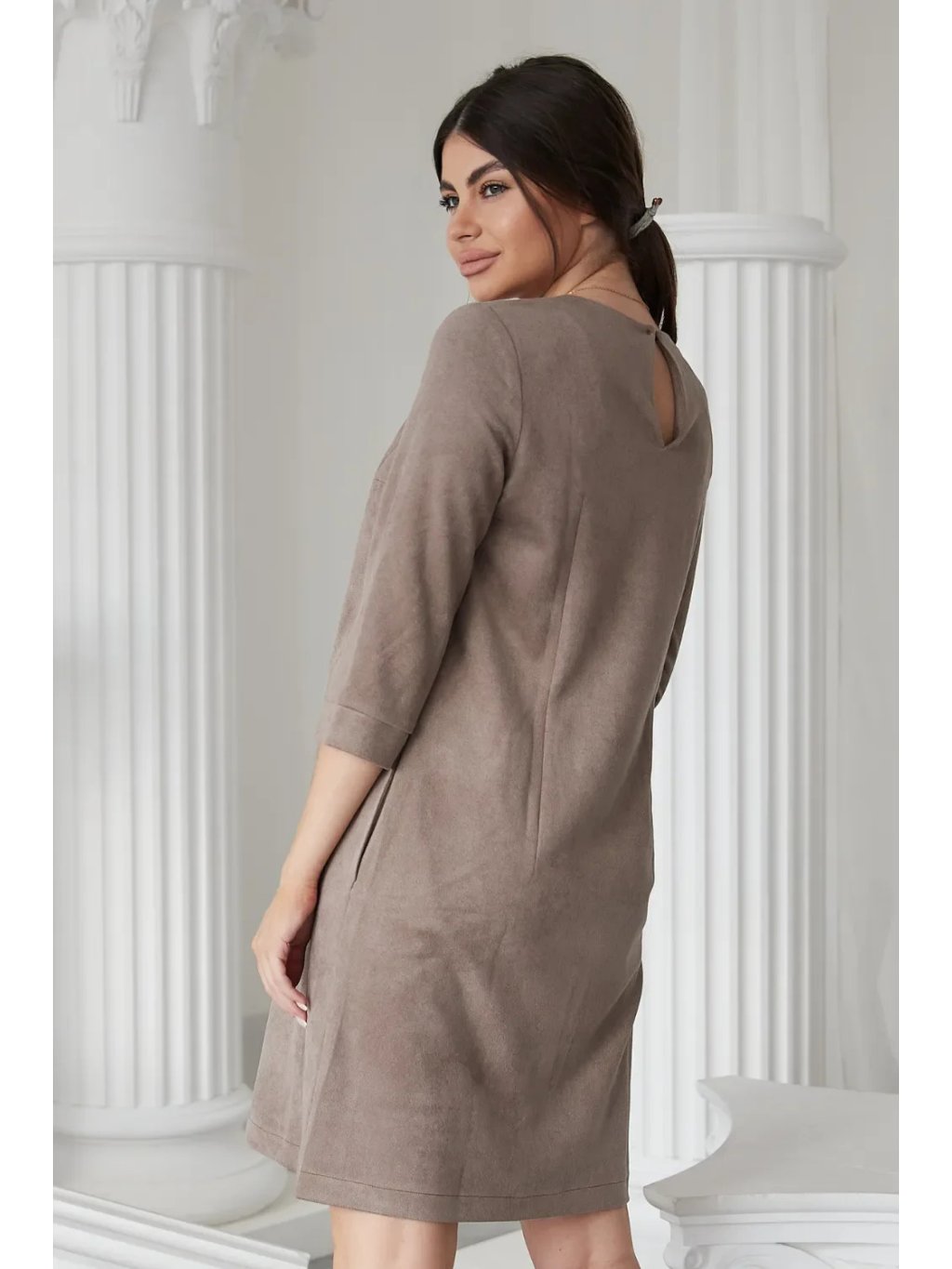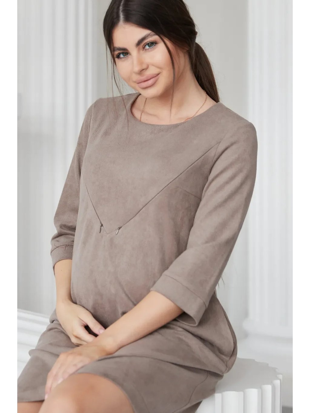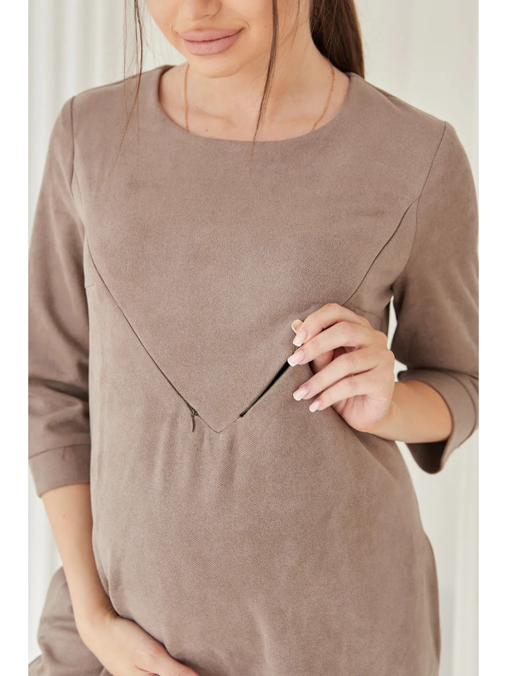 Elegantní těhotenské a kojicí šaty v hnědé cappuccino jsou navržené pro pohodlí i styl v každé fázi těhotenství a po porodu. Rovný střih lichotí postavě bez zbytečného obepnutí, 3/4 rukávy dodávají lehkost a kulatý výstřih působí čistě a nadčasově.