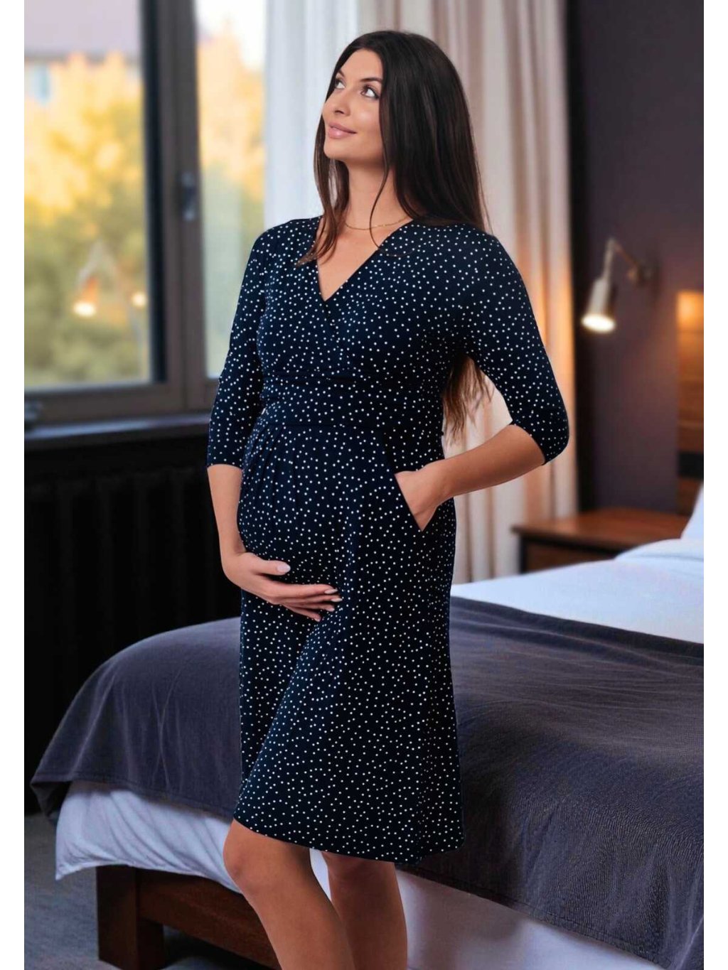 Těhotenské a kojící šaty s kapsami Chelsea 3v1 - modré s puntíky, 3/4 rukáv