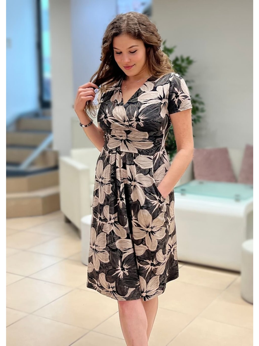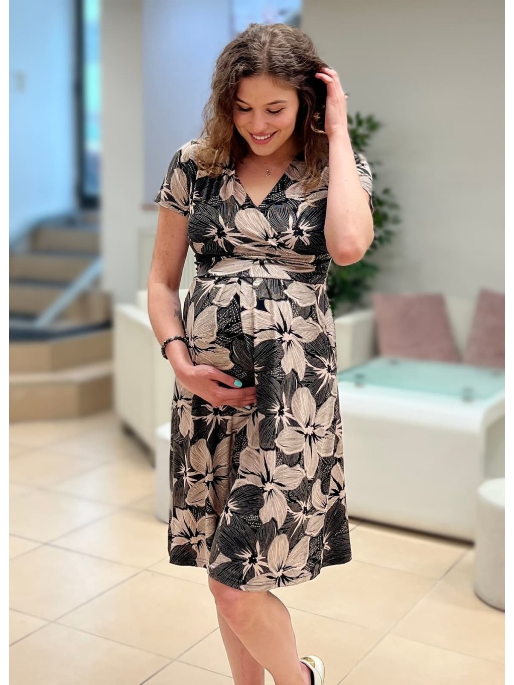 Těhotenské a kojící šaty s kapsami Chelsea béžové s černými květy