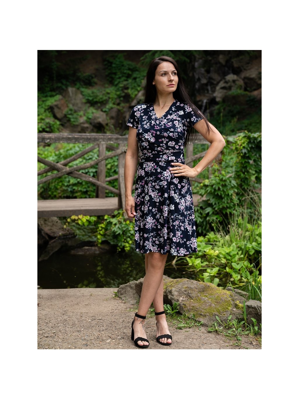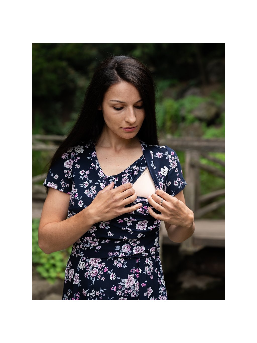Těhotenské a kojící šaty s uvazováním 3v1 Flower Garden modré s růžovými kvítky