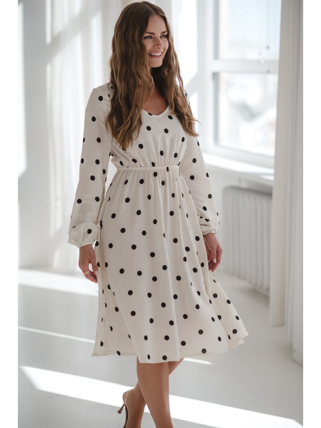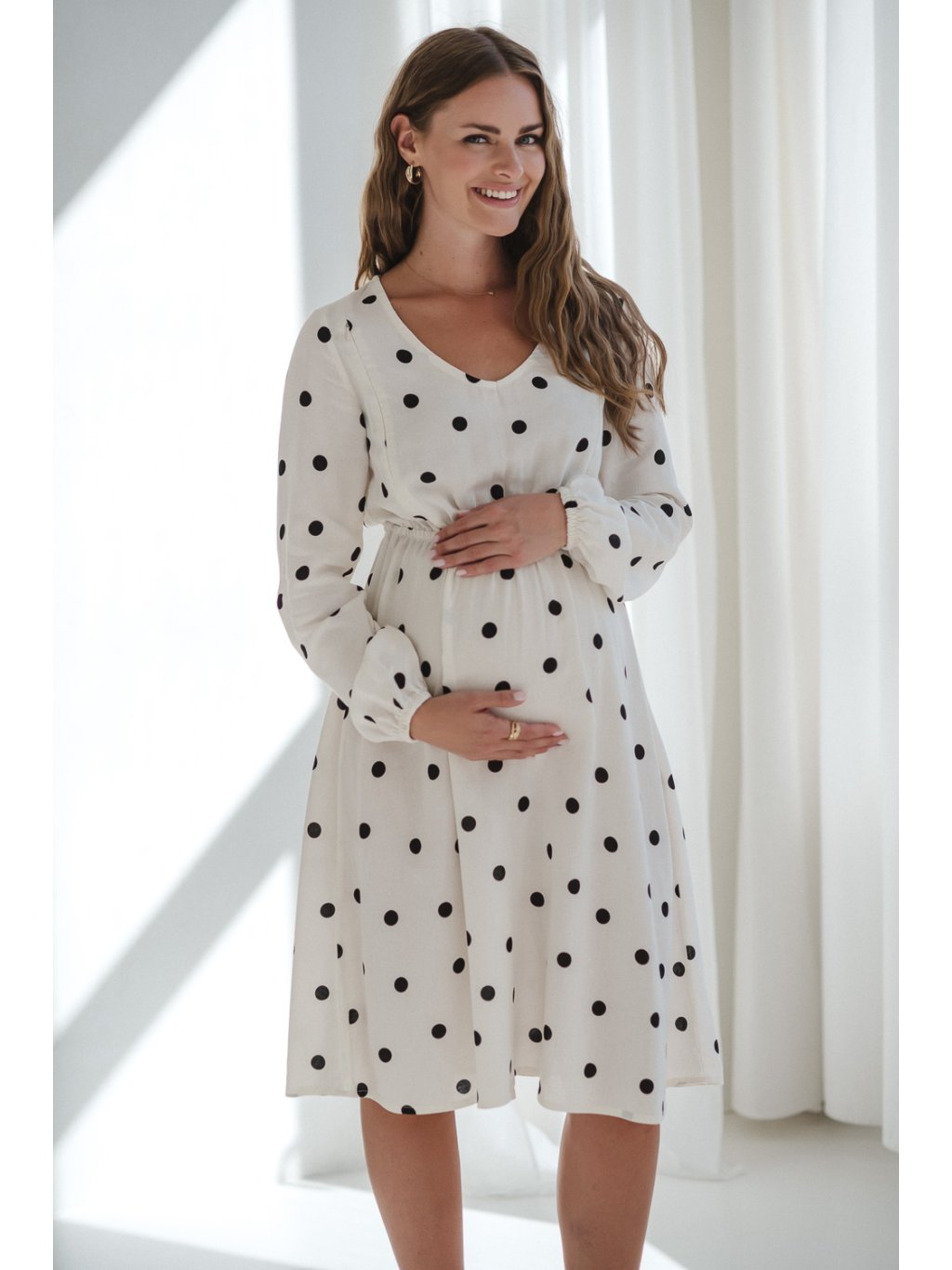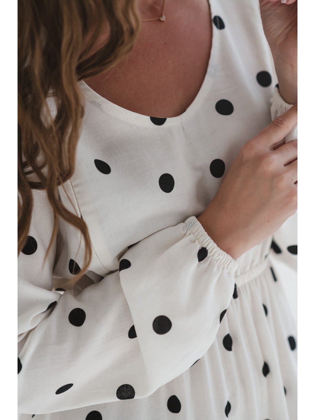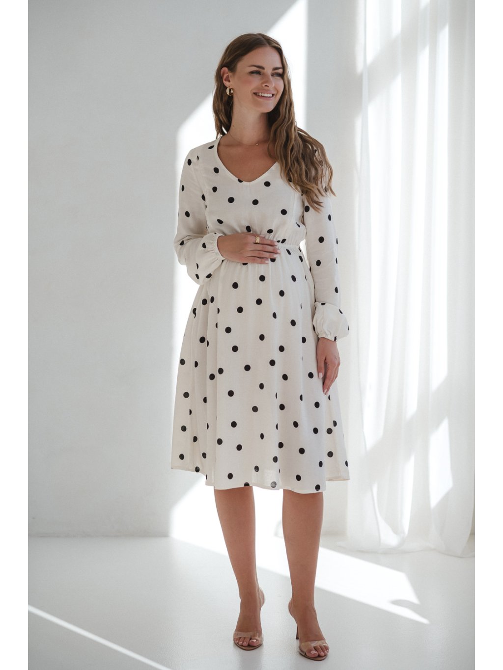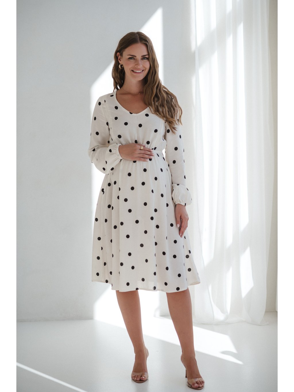 Těhotenské a kojicí šaty se lnem Lovely 3v1 - krémově bílé s puntíky, dlouhý rukáv