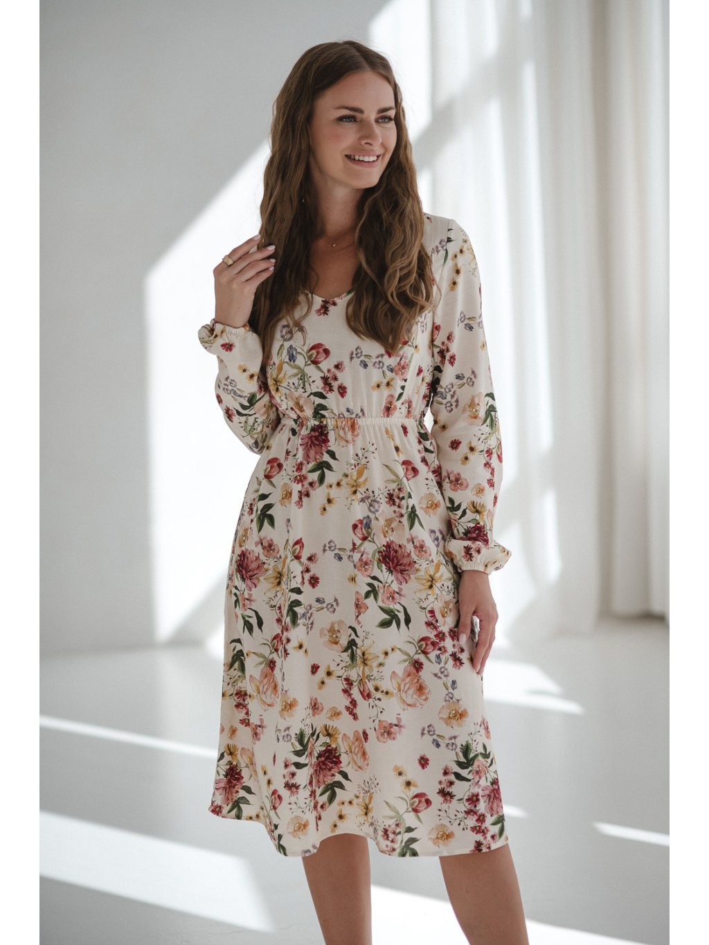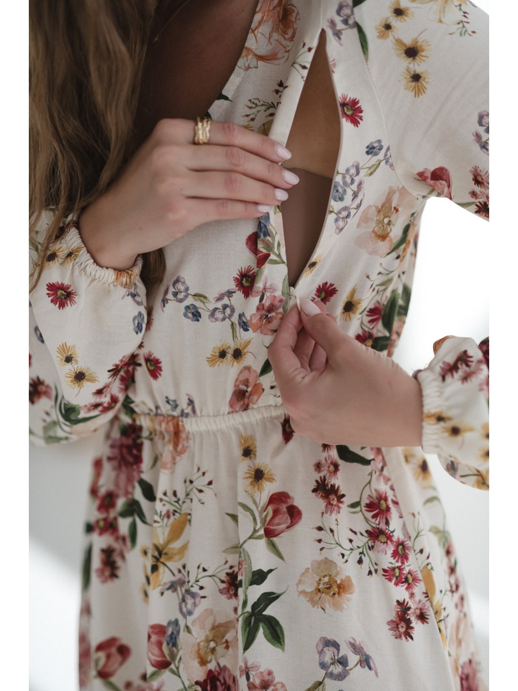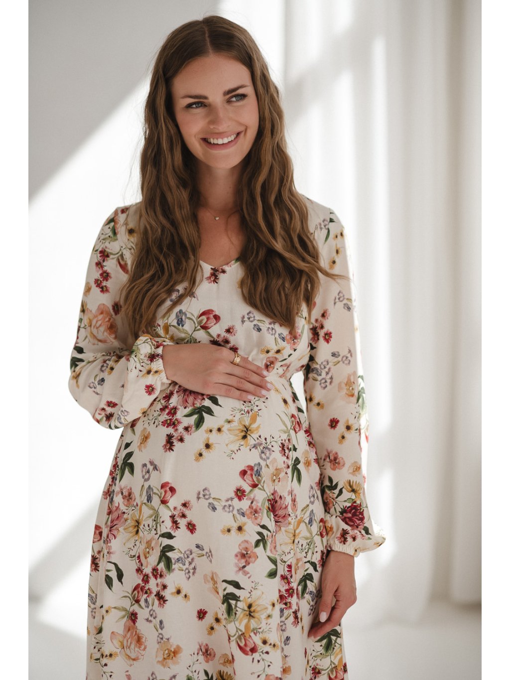 Těhotenské a kojicí šaty Lovely 3v1 – krémové květinové, dlouhý rukáv
